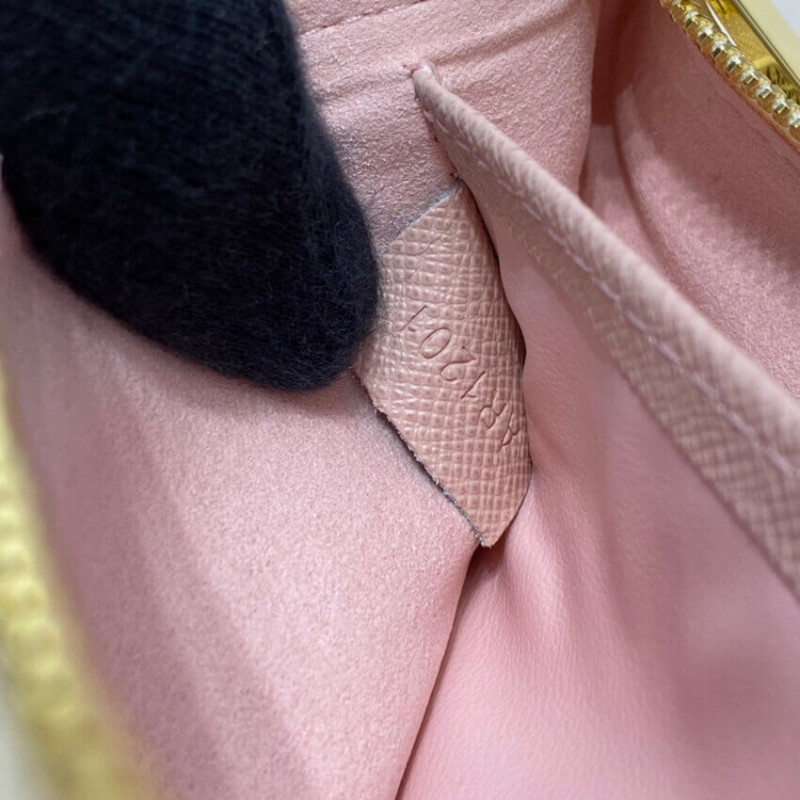 This summery version of the Double Zip Pochette comes in Damier Azur canvas with a removable strap in Louis Vuitton s emblematic natural cowhide leather. This versatile pouch features two secure zipped pockets with an open pocket in between. It is finished with a natural leather label embossed with the House signature.
