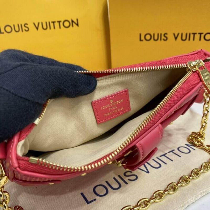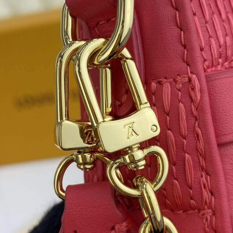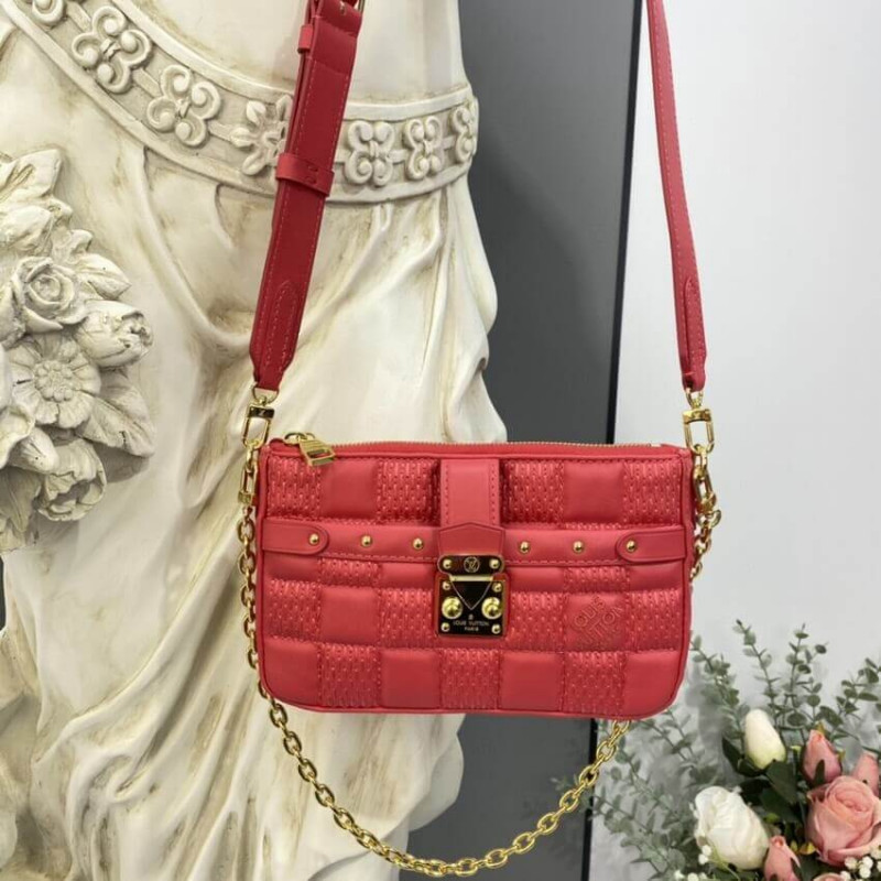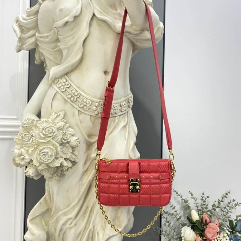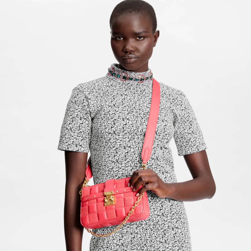 The Pochette Troca was inspired by a Louis Vuitton archive design: the Trocadéro camera bag. This reinterpretation retains the distinctive square, compact shape, which is complemented by trunk-inspired details, including an iconic S-lock. It is crafted from soft and quilted lambskin embroidered to replicate the historic Damier pattern. The Pochette Troca offers multiple carry options thanks to its removable chain and removable, adjustable shoulder strap.
