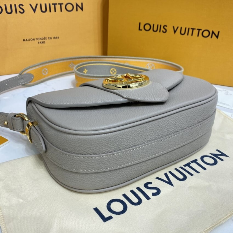 The LV Pont 9 Soft MM is a rounded handbag made from grained calfskin with smooth cowhide lining in a contrasting color and a wide two-color strap decorated with Monogram Flowers. The two sides of the strap are woven separately and then stitched together by hand. The new LV Circle signs this bag.