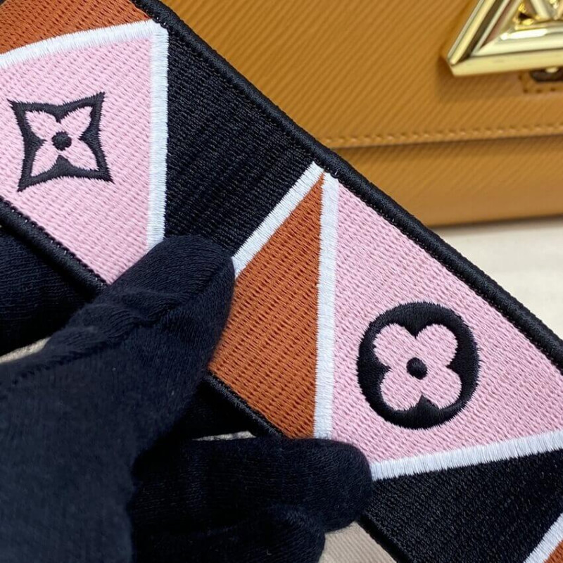 This season the Twist MM handbag is accessorized with a wide strap. Louis Vuitton is embroidered on one side and the geometric Karakoram design including Monogram Flowers on the other. Fashioned from Epi grained leather, it has a detachable bicolor Epi leather handle for hand carry. The gold-color LV Twist lock completes the design.