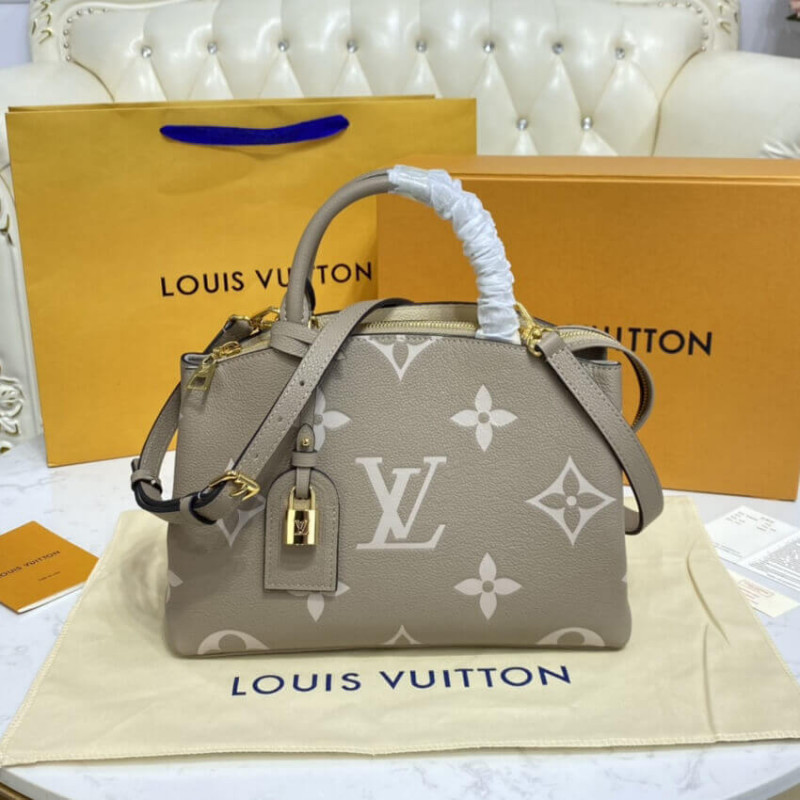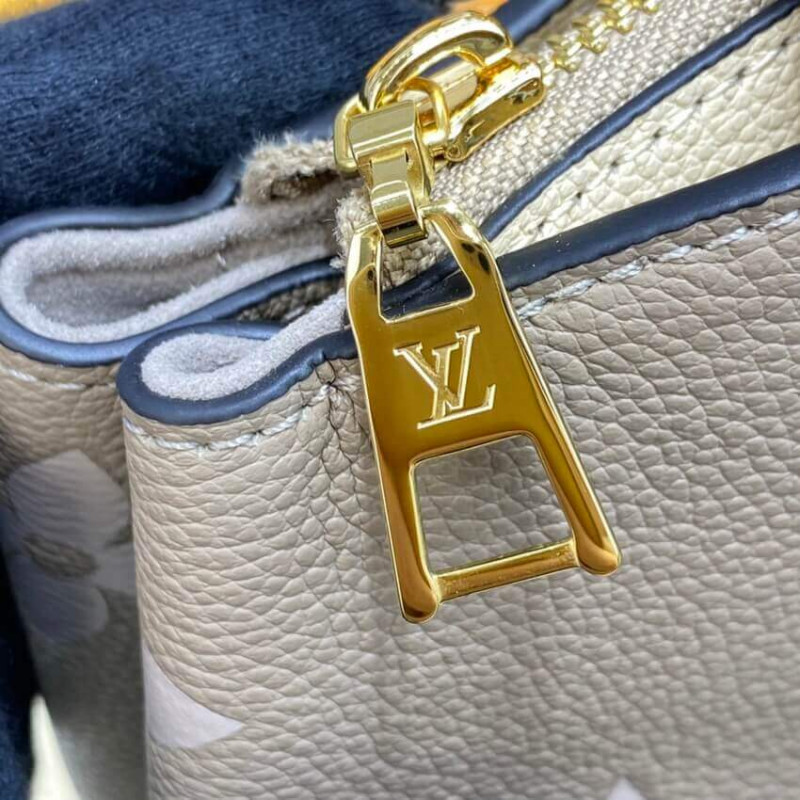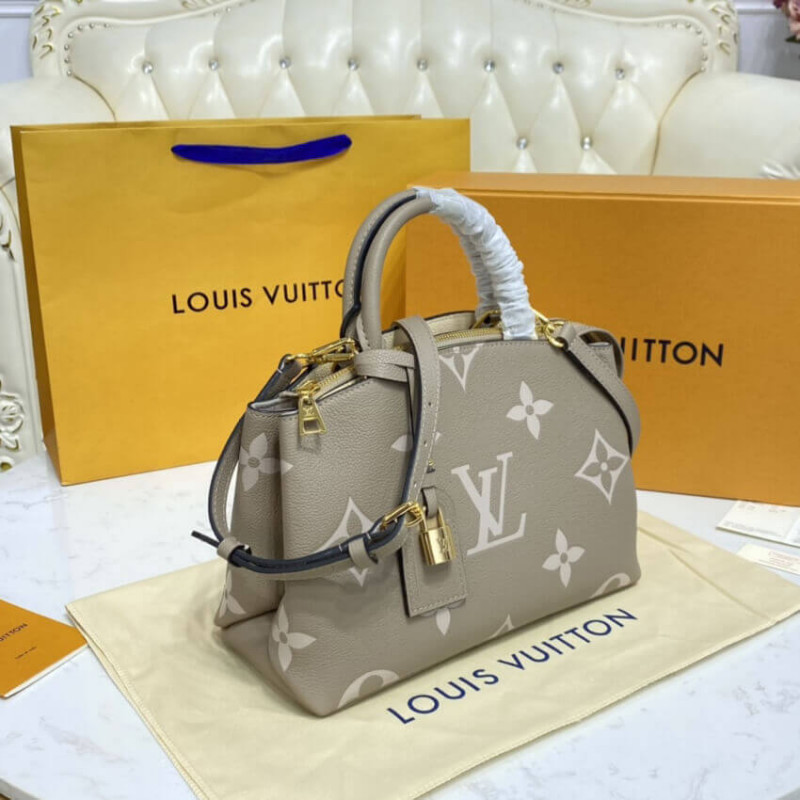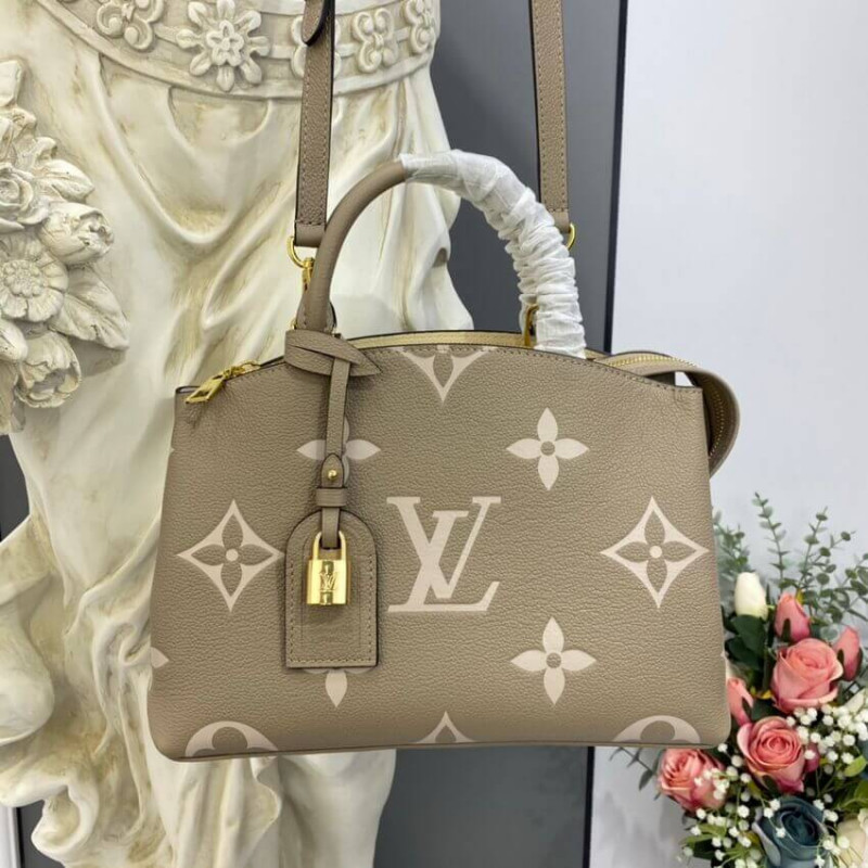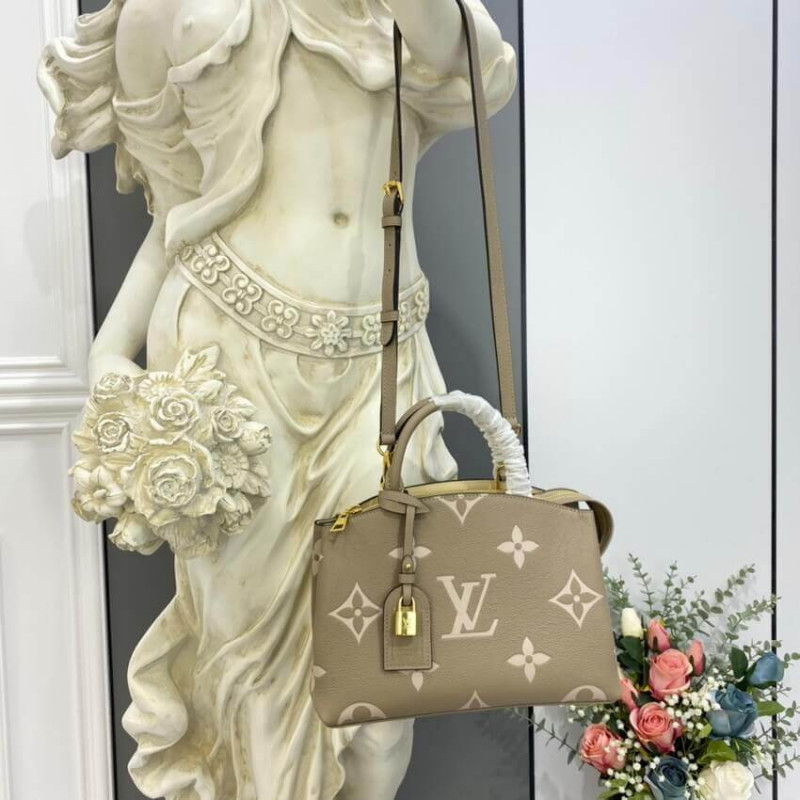 The perfect everyday companion, the smart and sophisticated Petit Palais handbag is fashioned from grained leather with an oversized pattern of Monogram Flowers and LVs printed and embossed on it. The gold-color padlock and leather name tag bring to mind the House’s legacy of fine luggage. A detachable strap can be adjusted for comfortable shoulder and cross-body wear.