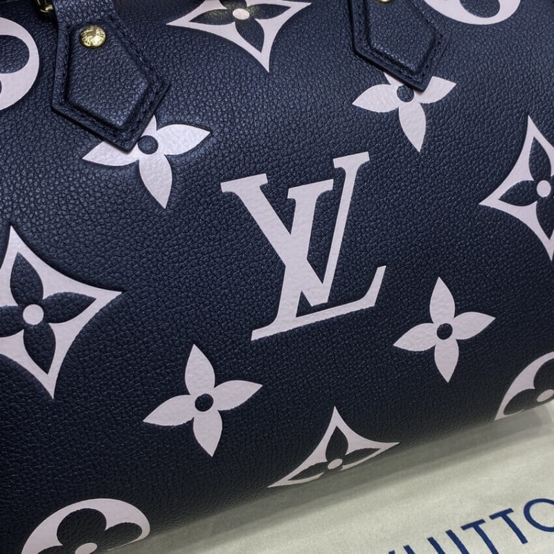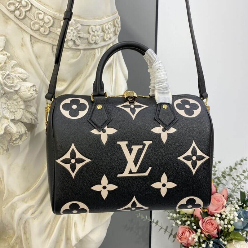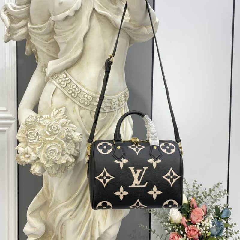 The compact Speedy Bandoulière 25 handbag is made from black Monogram Empreinte leather with the embossed Oversized Monogram pattern in beige. This sophisticated handbag was inspired by the House’s “Express” bag from 1930. Finished with gold-color hardware, the interior is lined in red. A detachable and adjustable shoulder strap, in addition to the top handles, enables carry options.
