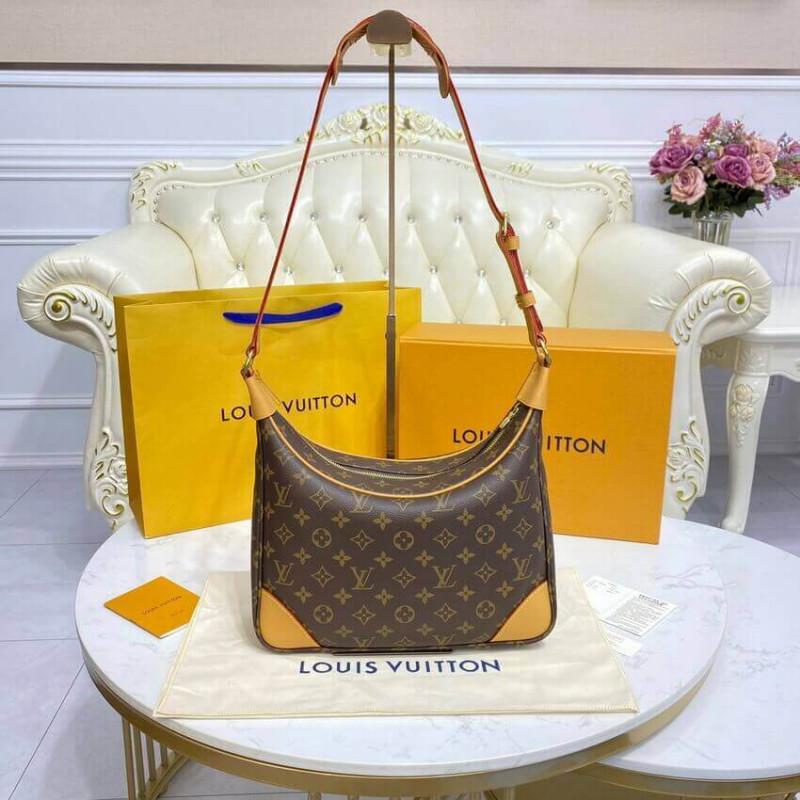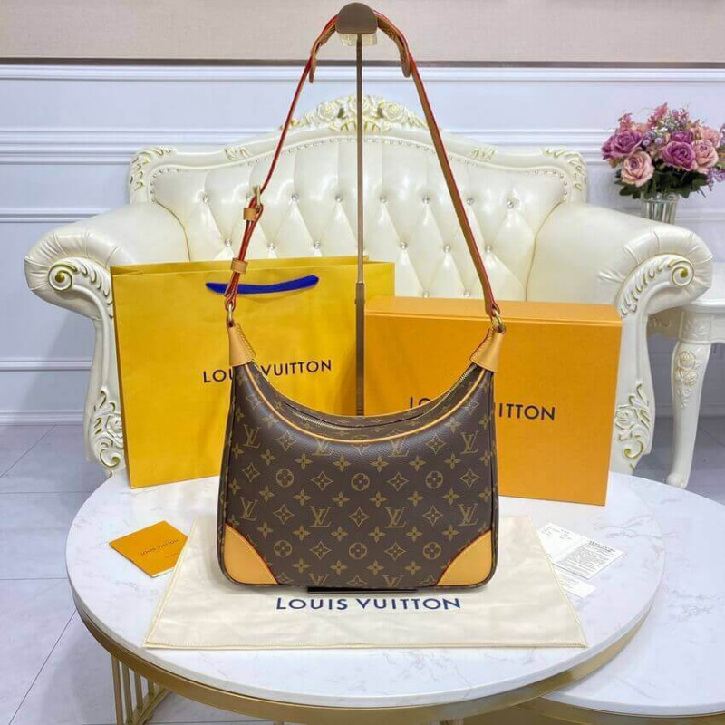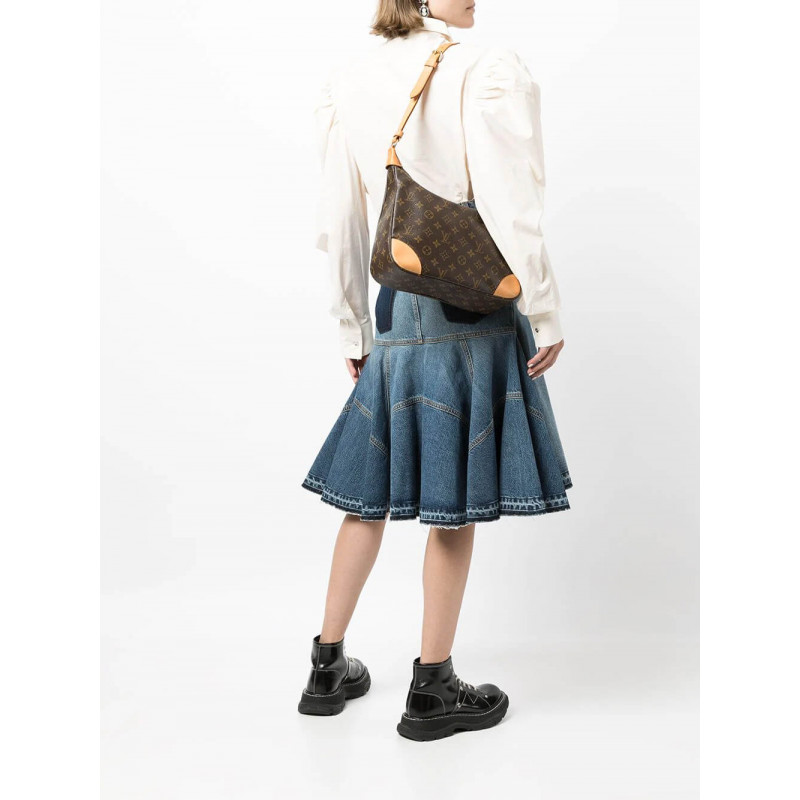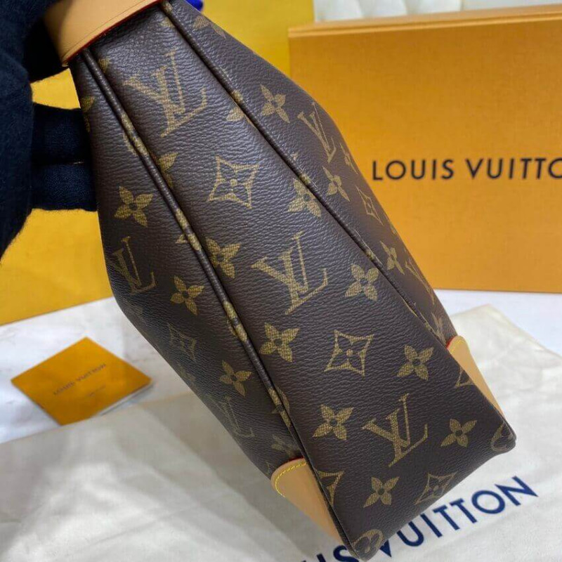 This chic shoulder bag is composed of Louis Vuitton monogram on toile canvas. The bag features a vachetta cowhide leather looping shoulder strap and base corners with brass hardware. The top zipper opens to a terra-cotta cross-grain leather interior.