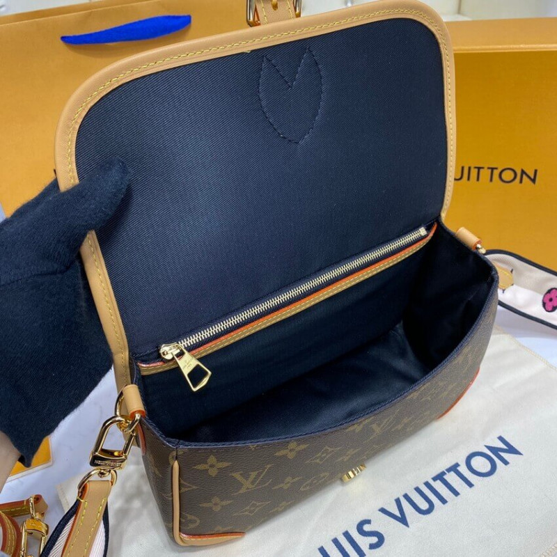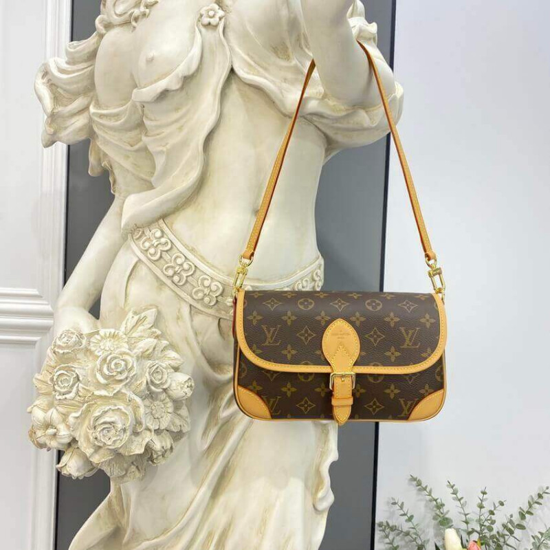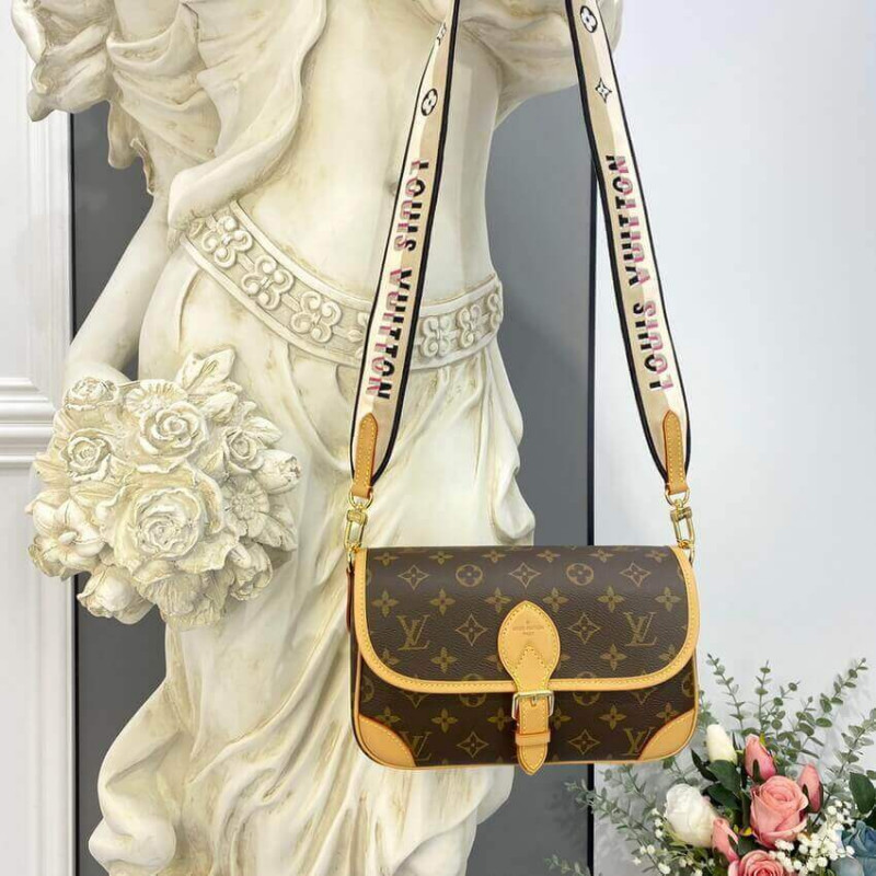 The Diane satchel in Monogram canvas revisits a classic model from the 90s, combining such vintage details as leather corners and an archival-inspired buckle with the modern functionality of smart pockets and a well-organized interior. The exclusive wide jacquard strap reverses from a bold Louis Vuitton signature to a subtle Monogram Flower motif.