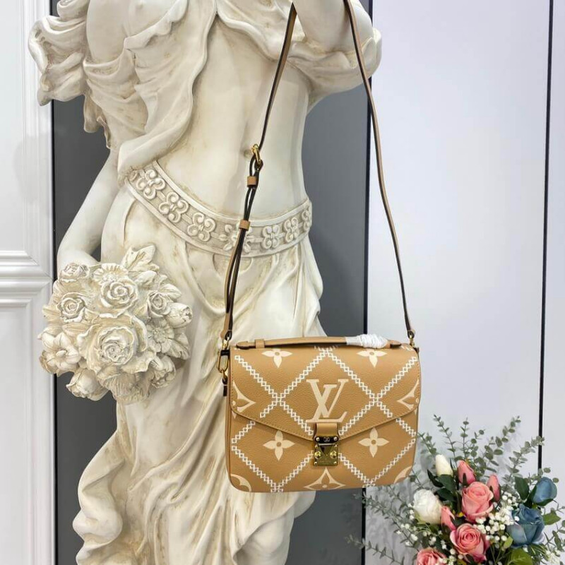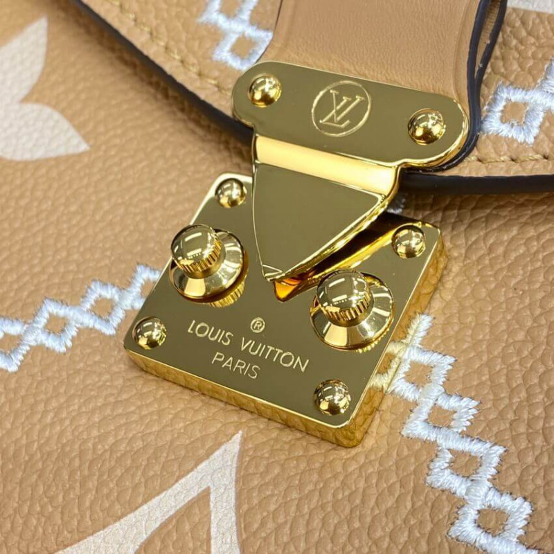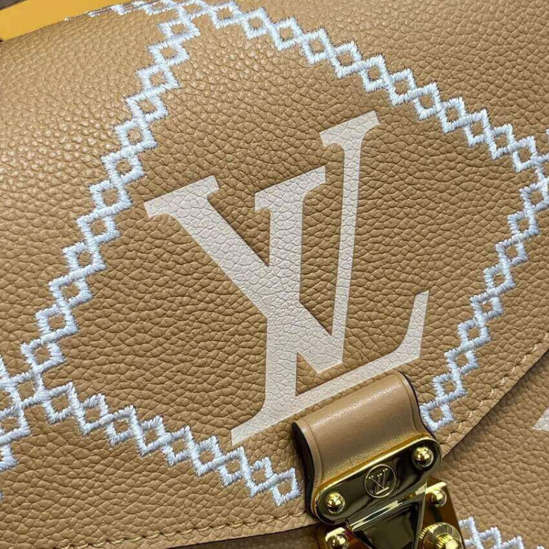 For Spring 2022 the Pochette Metis handbag in Monogram Empreinte leather is embellished with embroidery inspired by the quilted linings of original Louis Vuitton trunks. House craftsmanship shines in the colors and textures of the stitching against a background of embossed leather. This versatile statement piece features a convenient top handle and a removable cross-body strap.