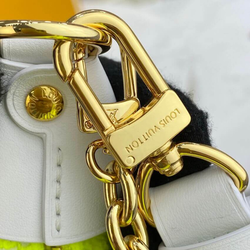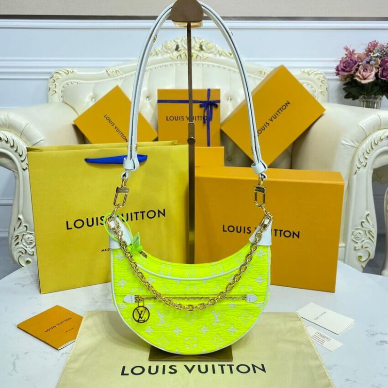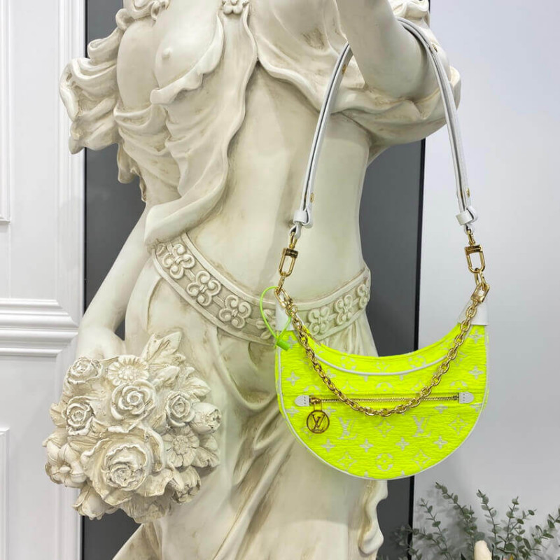 The Loop half-moon baguette bag is fashioned from Monogram jacquard velvet in a bright yellow color, reminiscent of the iconic yellow of tennis balls. The jacquard velour is a 100% sustainable material made from recycled yarn.