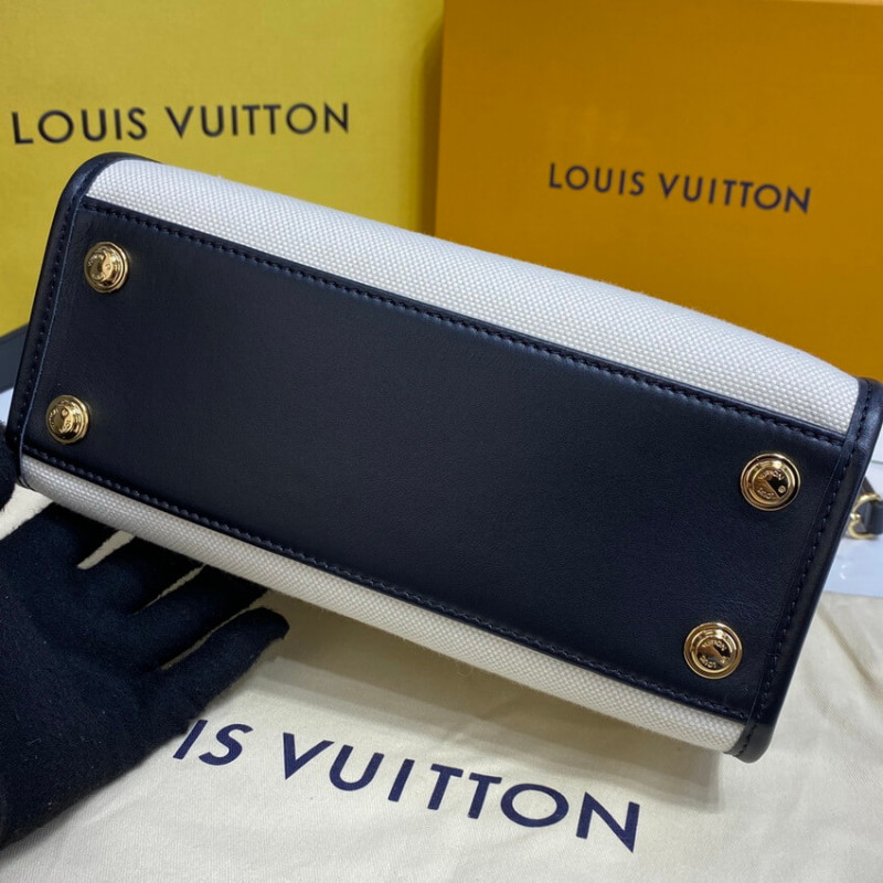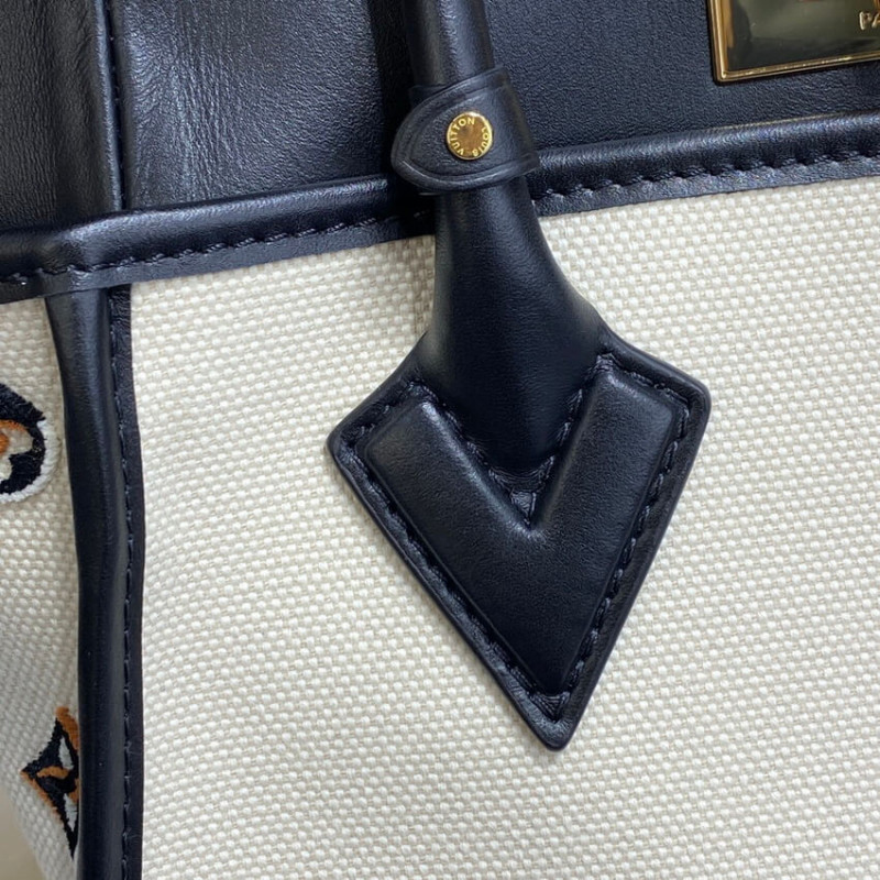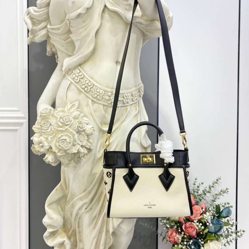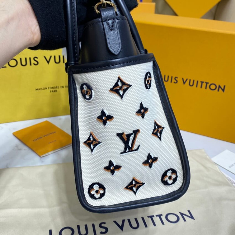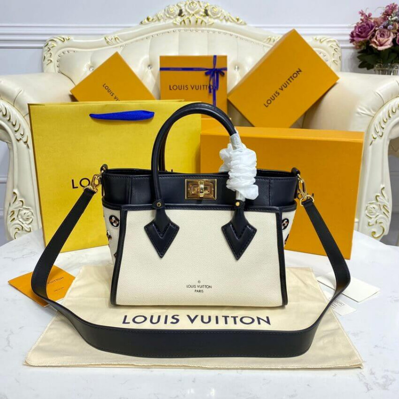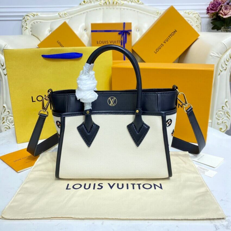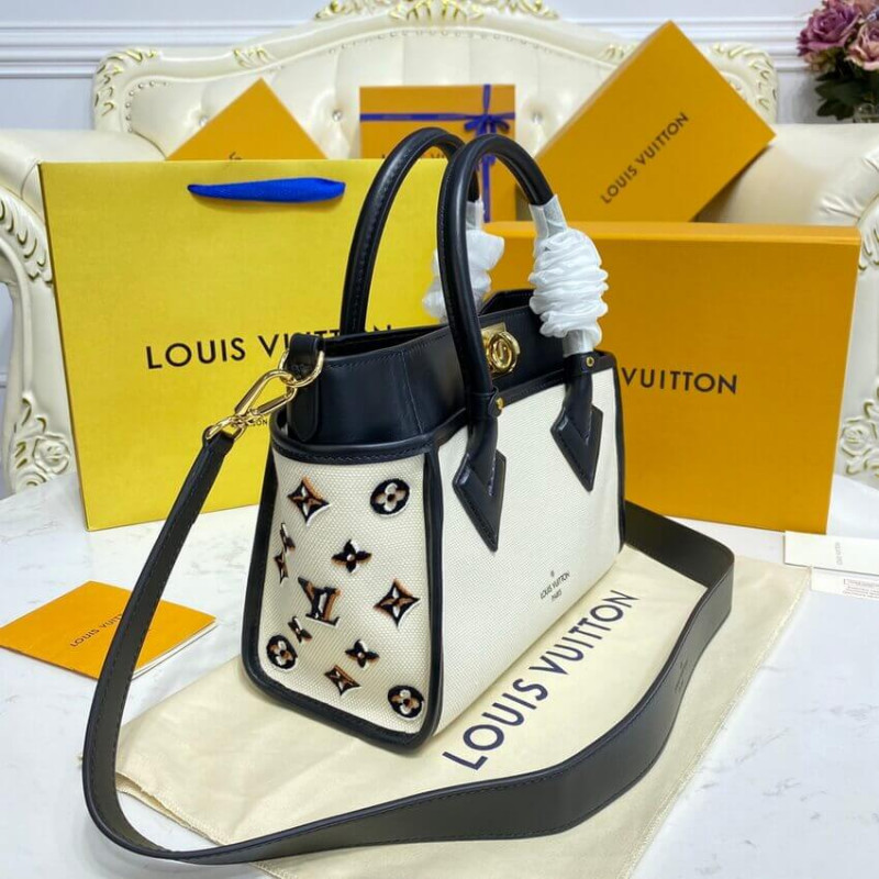 A summery edition of the On My Side PM with this compact tote bag made from canvas with smooth leather around the top and rolled-leather top handles. The design features Monogram Flower tufting on the bag’s sides to higlight the signature style of the bag and a removable strap for comfortable cross-body wear. Two outside pockets give quick access to essentials.