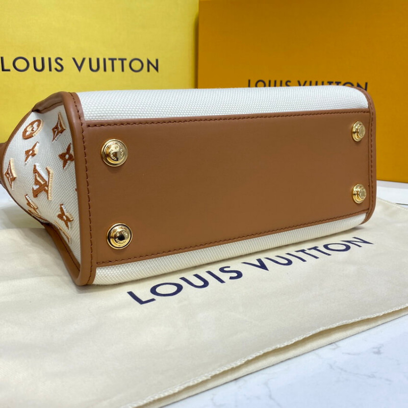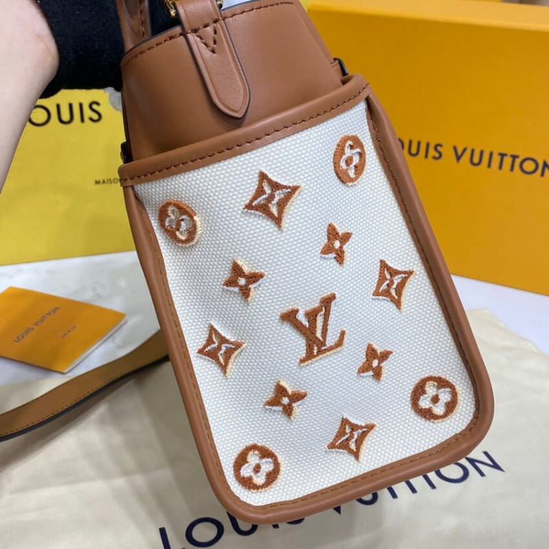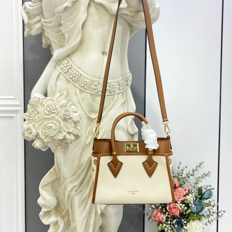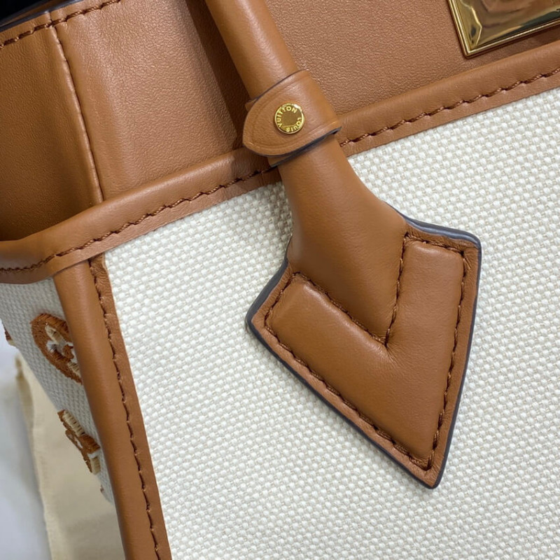 A summery edition of the On My Side PM with this compact tote bag made from canvas with smooth leather around the top and rolled-leather top handles. The design features Monogram Flower tufting on the bag’s sides to higlight the signature style of the bag and a removable strap for comfortable cross-body wear. Two outside pockets give quick access to essentials.