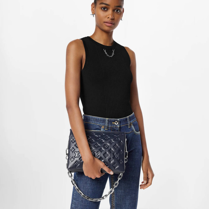 Fashioned from puffy lambskin and accessorized with a chunky silver-color chain, this Coussin PM handbag is part of the Fall-Winter 2020-21 Collection. Its bright vibrant colorway is Nicolas Ghesquière’s translation of the joy and audacity of women. The Coussin can be worn cross-body with the strap, as a chain baguette, or carried under the arm.