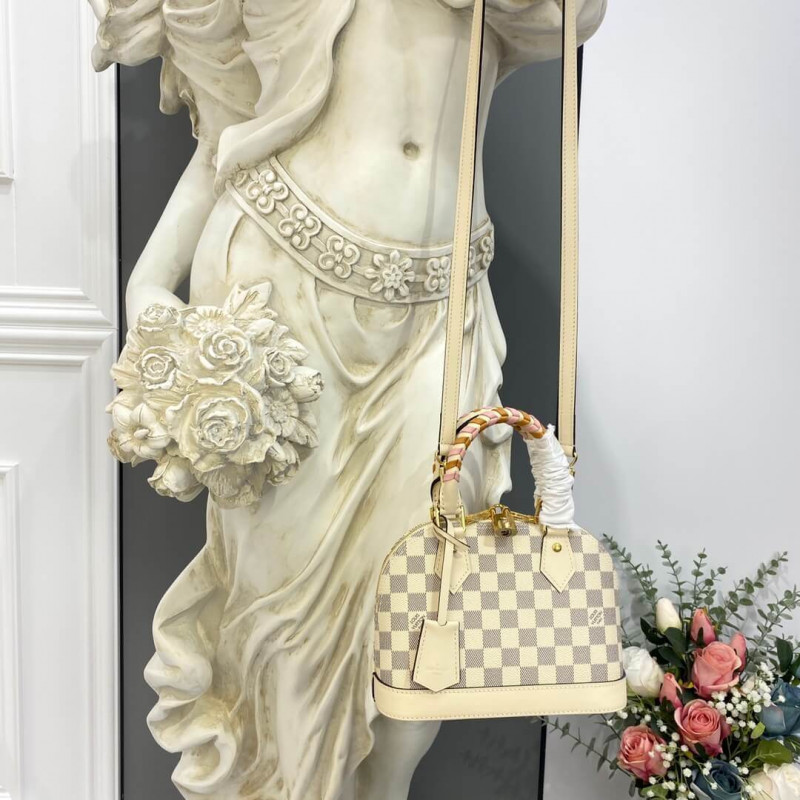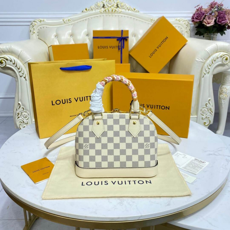 The Alma BB bag welcomes Spring 2022 in a charming edition made from Damier Azur coated canvas, with a leather trim in delicate shades of pink and cream. Two braided Toron top handles lend this model a crafted, feminine allure. The detachable long leather strap provides extra versatility for over-the-shoulder or cross-body wear.
