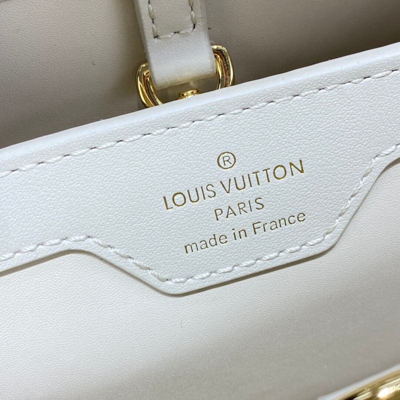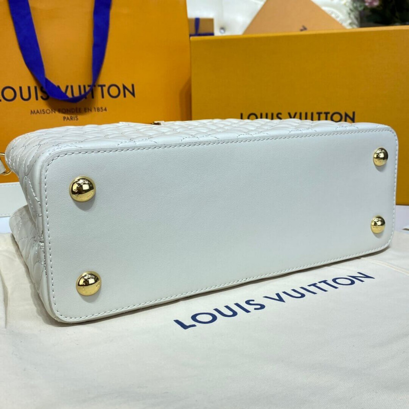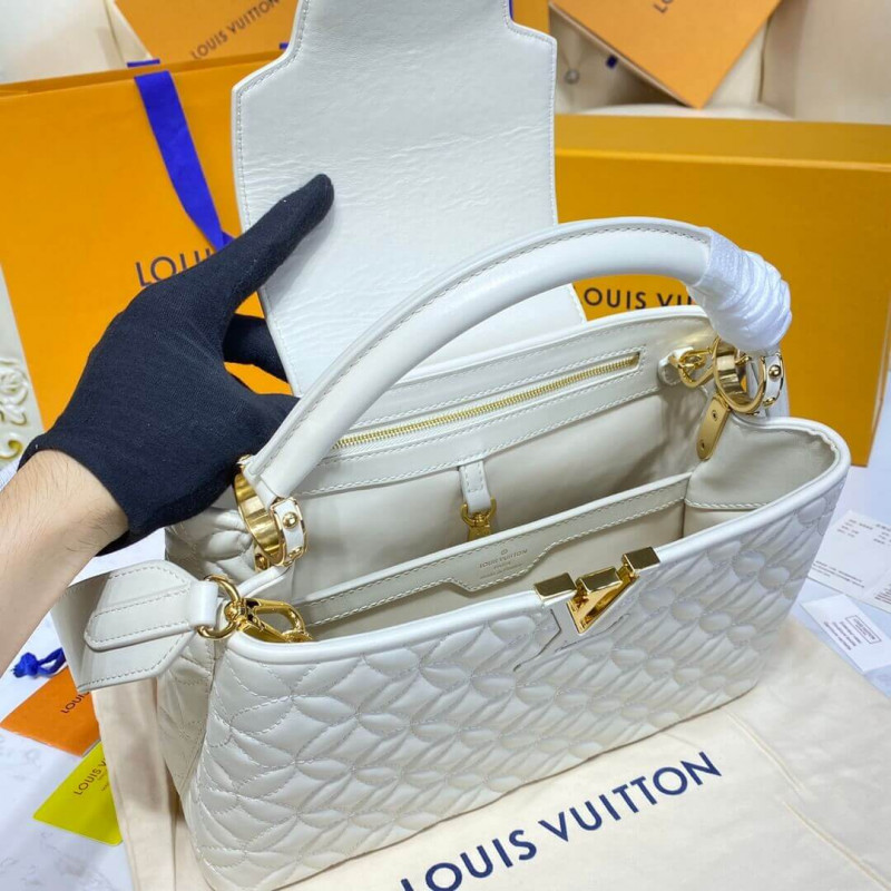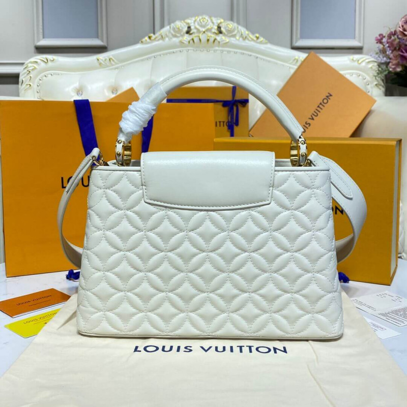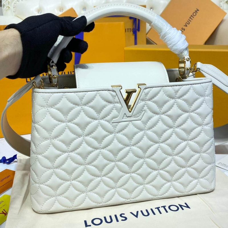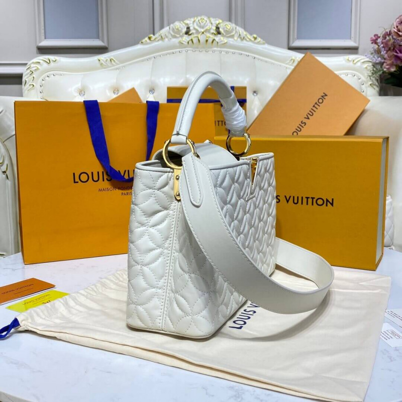 The elegant quilting of this Capucines MM handbag subtly reprises the Monogram Flower design, a pattern that also features in the décor of Louis Vuitton stores. Both the body and trim of this sophisticated model are crafted from soft lambskin. The bag’s removable strap is extra wide, for an especially comfortable shoulder carry.