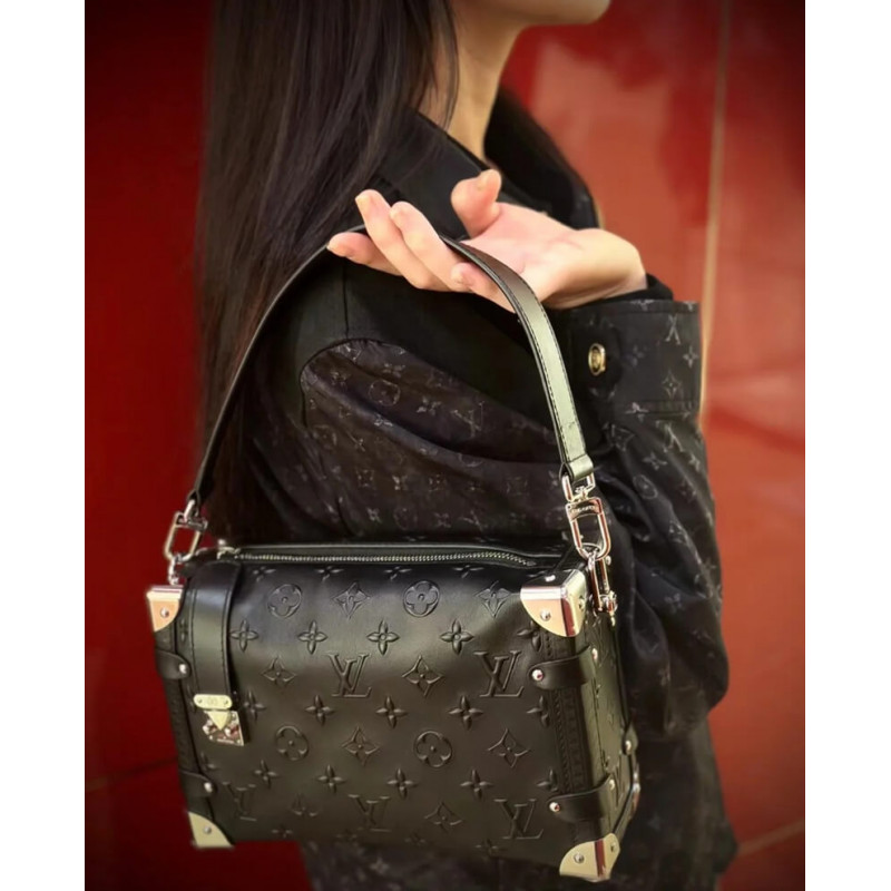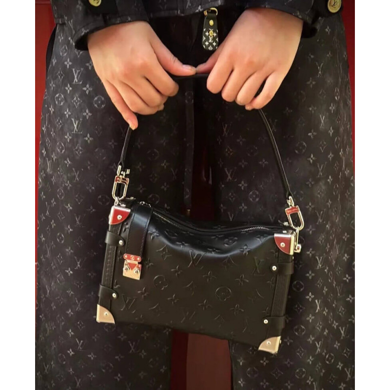 Nicolas Ghesquière twists the iconic Petite Malle into a new body-friendly shape featuring all the codes of the traditional trunk: the Side Trunk PM handbag. Made from Monogram-debossed, calfskin leather, the Side Trunk features a side S-lock and metallic corners. A wide top handle and a thin adjustable strap, both detachable, enable a variety of carries.