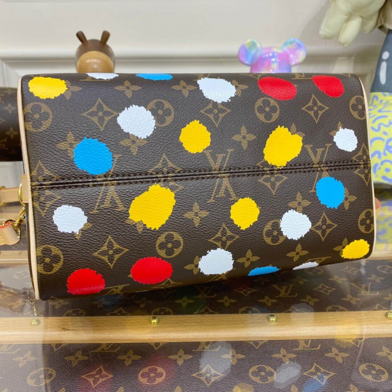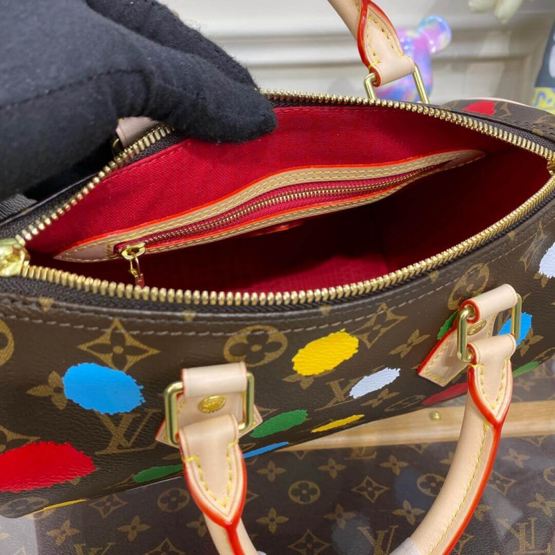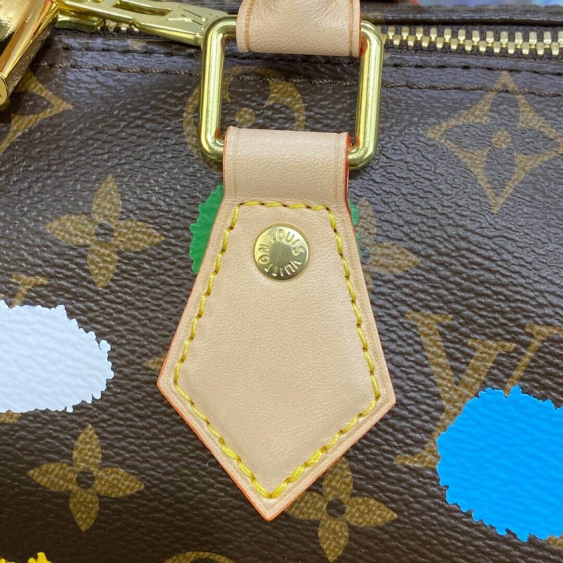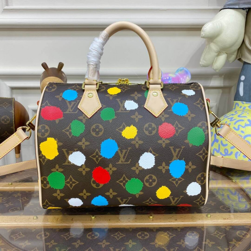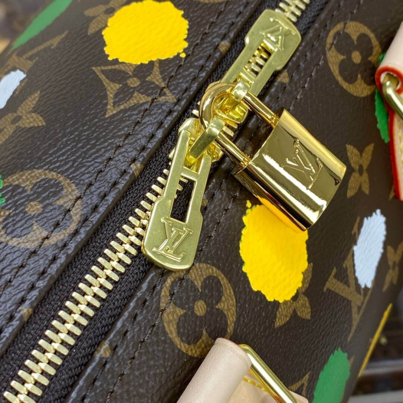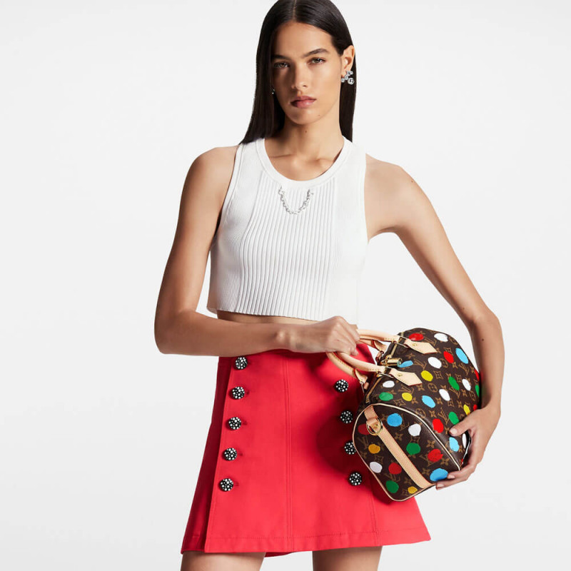 The LVxYK Speedy Bandoulière 25 celebrates art and hand craftsmanship as part of the second Louis Vuitton x Yayoi Kusama collection. The revered Japanese artist is known for her dazzling arrays of dots, like the colorful pattern adorning this version of the Speedy. Monogram canvas is screen-printed using a complex method that produces a 3D relief effect. A fun and creative update of a practical city bag.