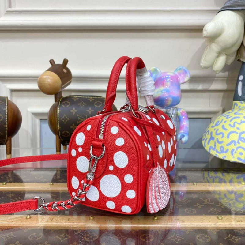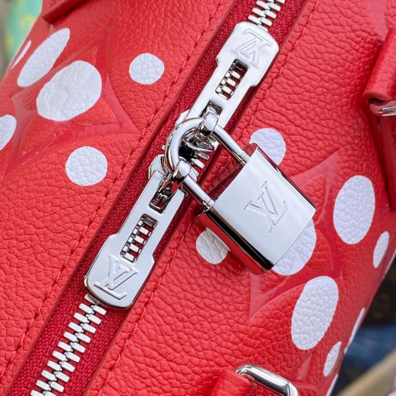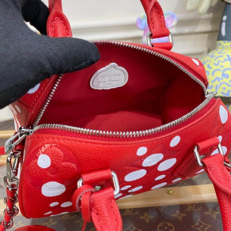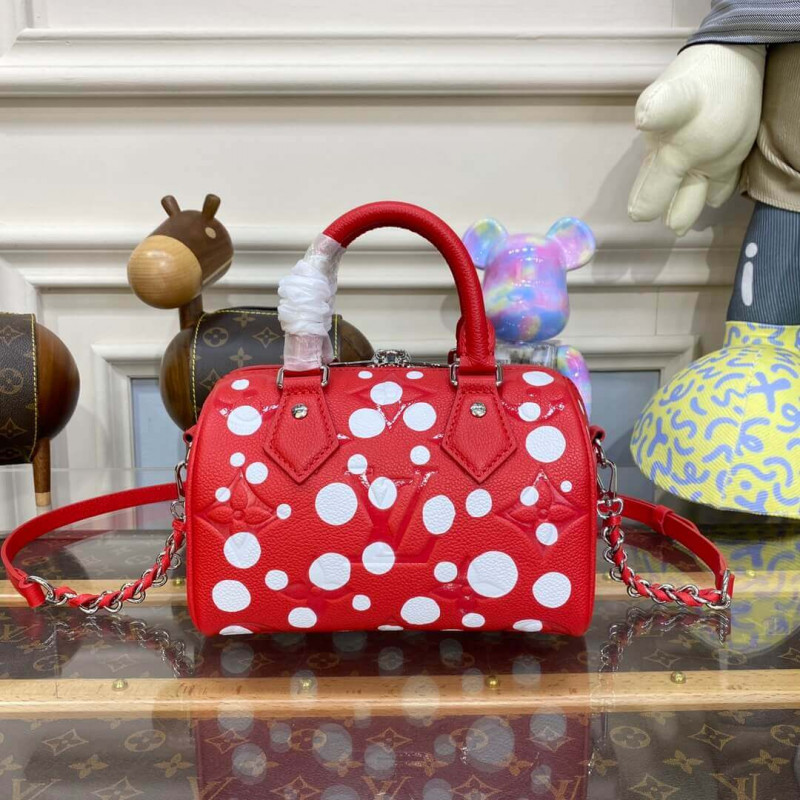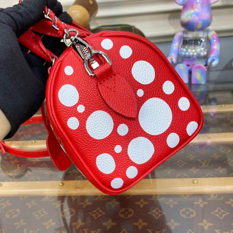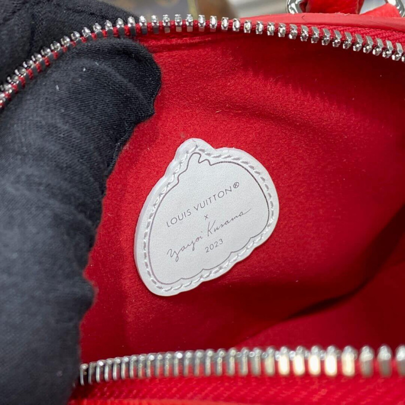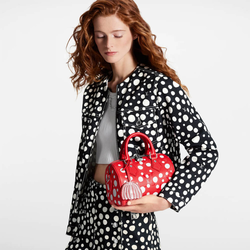For the new Louis Vuitton x Yayoi Kusama collection, the LVxYK Speedy Bandoulière 20 gets a burst of creative energy with the “Infinity Dots” design. Cheerful white dots are screen-printed on red Monogram Empreinte cowhide, echoing one of the recurring themes in the renowned Japanese artist’s work. And it comes with a charm shaped like a pumpkin, another of Kusama’s visual signatures. A celebration of artistry and craftsmanship.