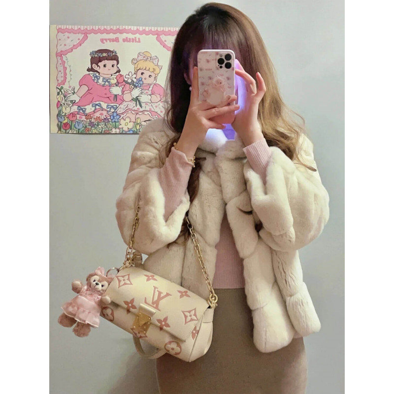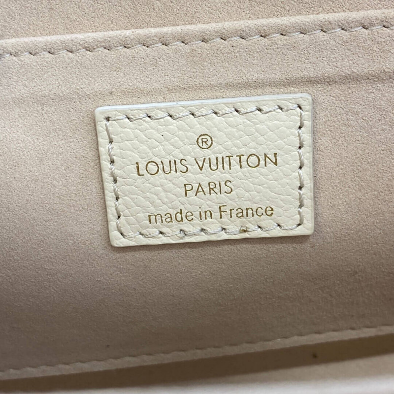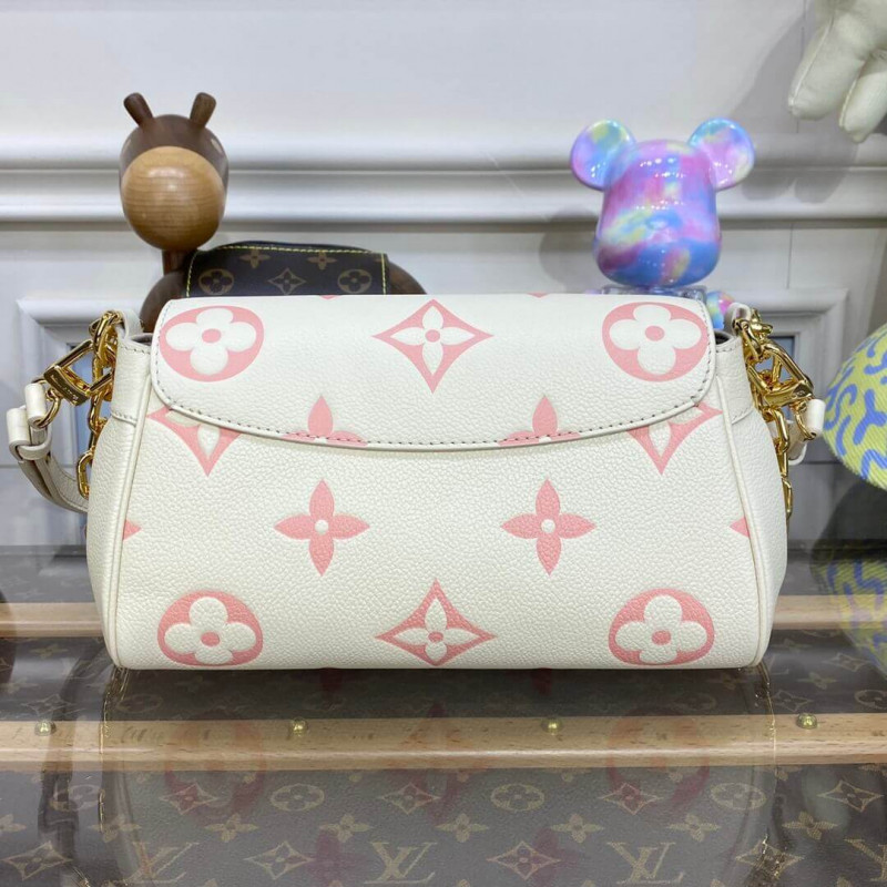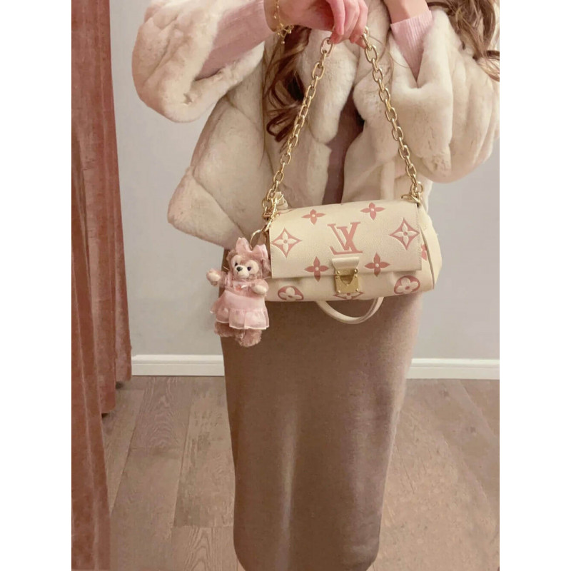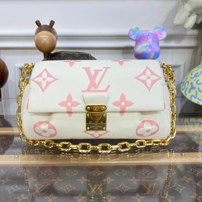 The Favorite handbag is fashioned from embossed Monogram Empreinte leather, with a pink Monogram motif printed on a cream-color background. Lined in a greige-toned microfiber, this baguette shoulder bag has a removable and adjustable leather strap for shoulder or cross-body carry as well as a removable golden chain