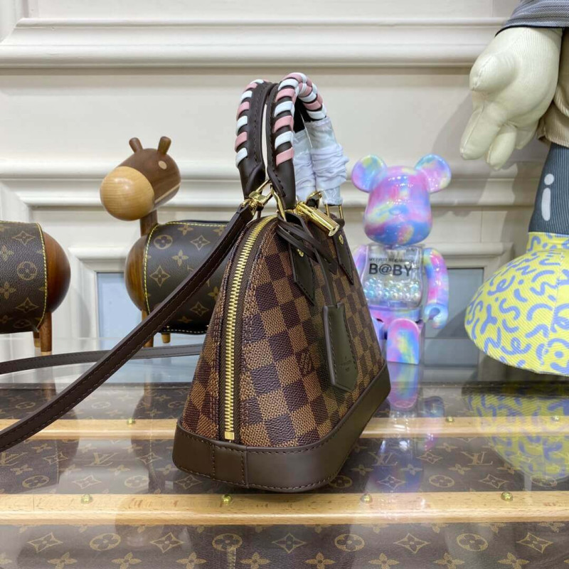 For the new season this Alma BB handbag sports a fresh take on the Maison’s signature Damier Ebene canvas. The color play on the bag’s braided handles add an irresistible crafted touch to this feminine piece, which can be styled in a host of ways, from hand carry to cross-body and more.