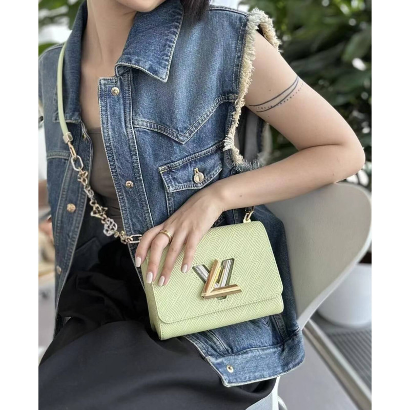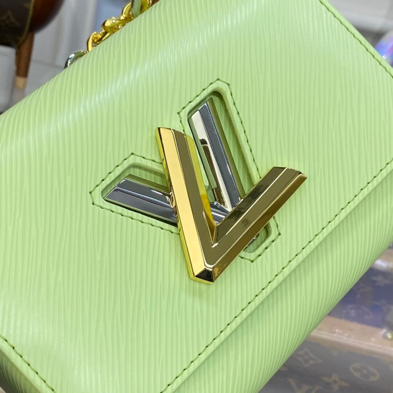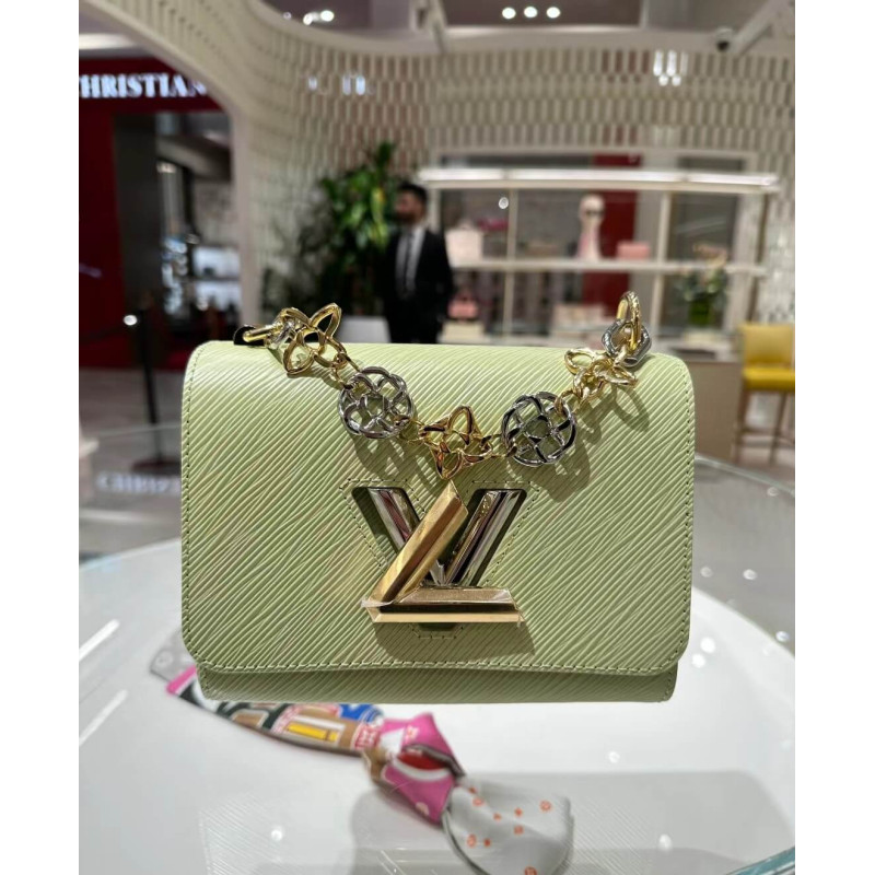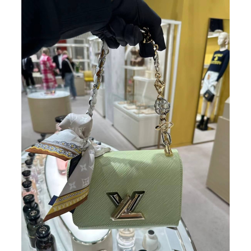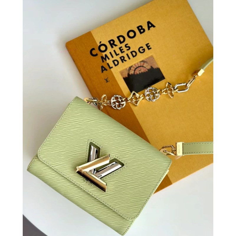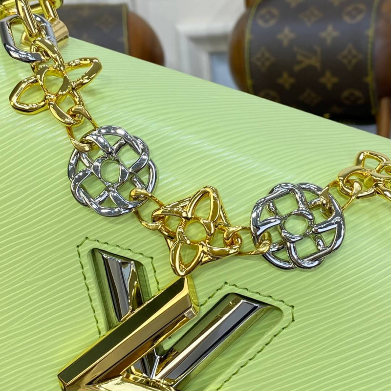 This Twist PM handbag features a gold-and-silver-color chain, adorned with Monogram Flowers delicately twisted so that they become links in the chain. The chain can function as a decorative accessory or be attached to the removable shoulder strap to enable cross-body carry. The signature LV Twist lock also a gold and silver color.