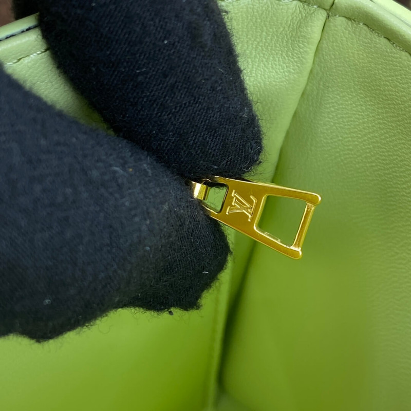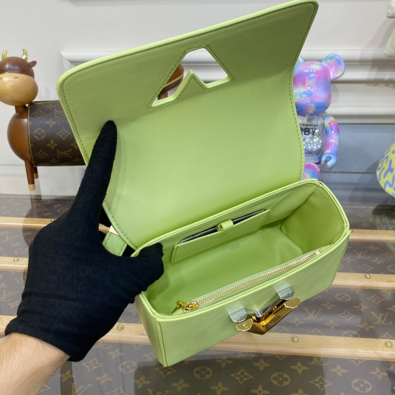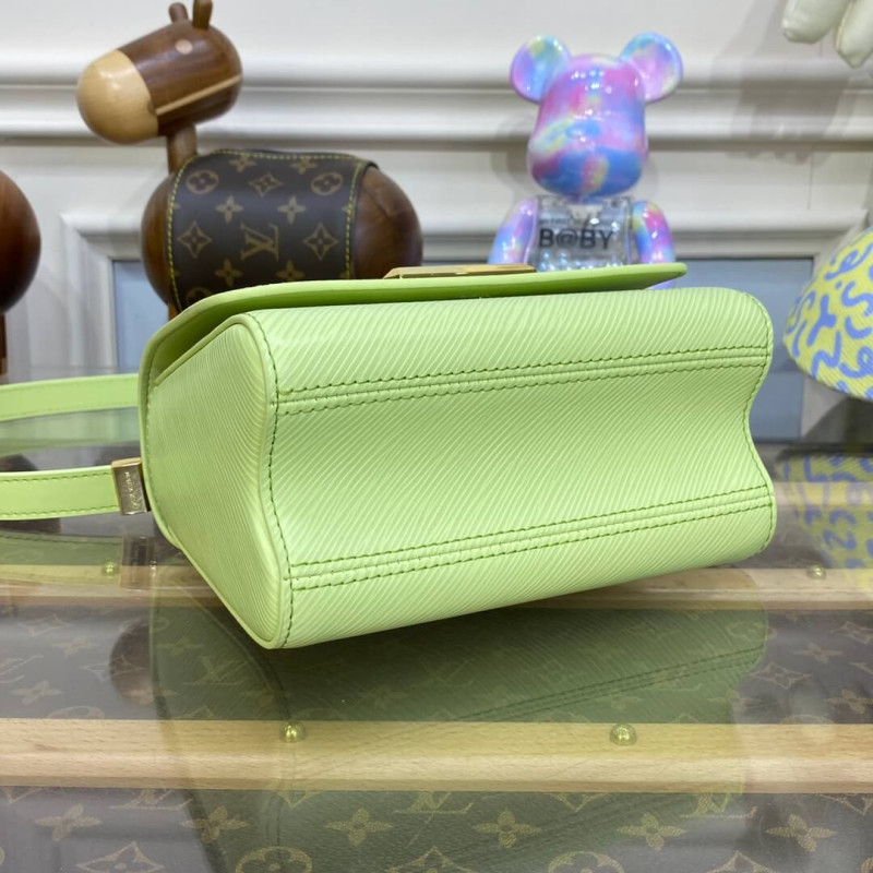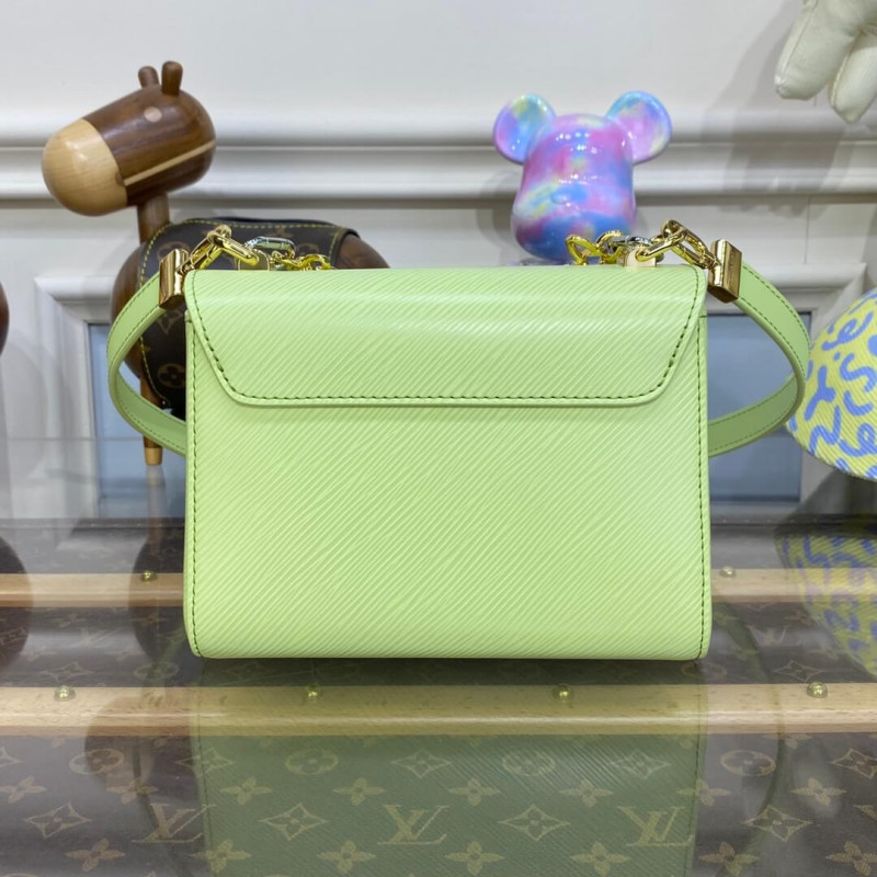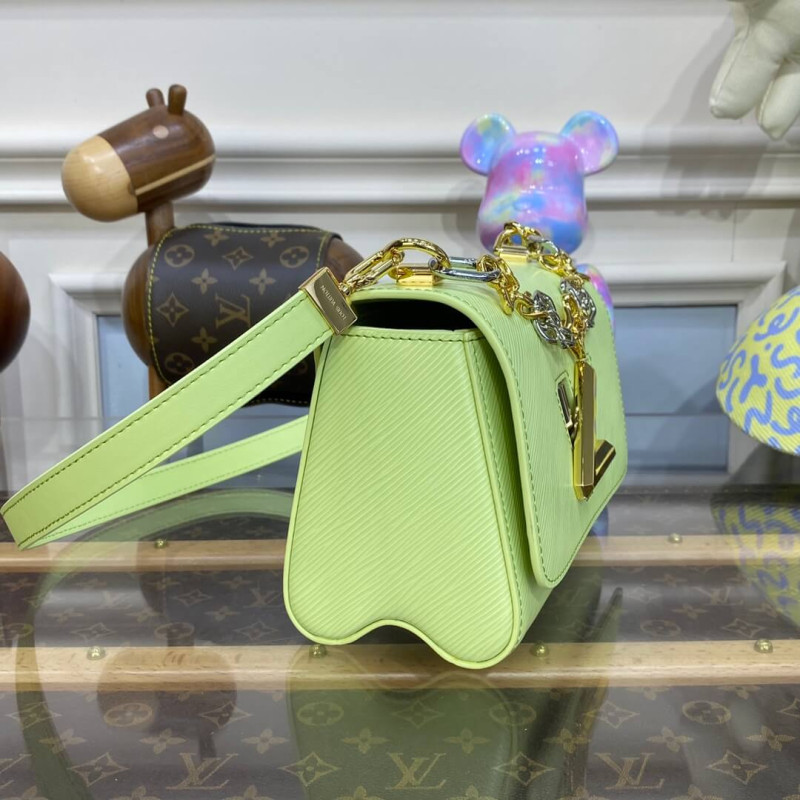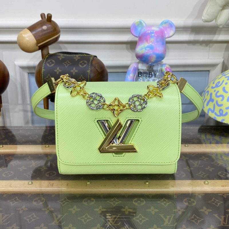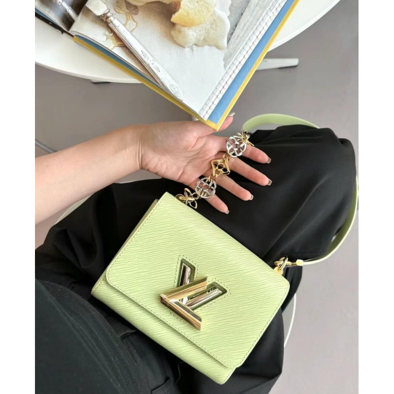 This Twist PM handbag features a gold-and-silver-color chain, adorned with Monogram Flowers delicately twisted so that they become links in the chain. The chain can function as a decorative accessory or be attached to the removable shoulder strap to enable cross-body carry. The signature LV Twist lock also a gold and silver color.