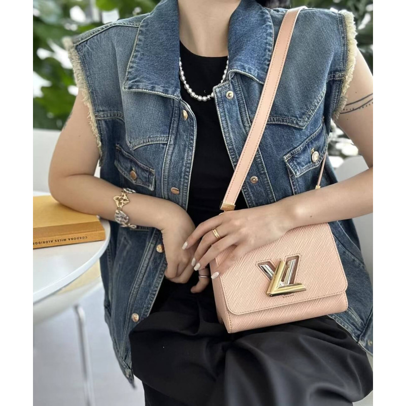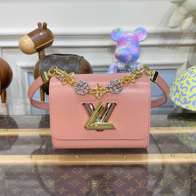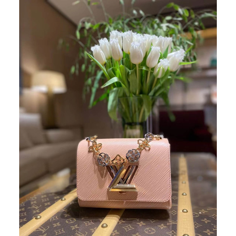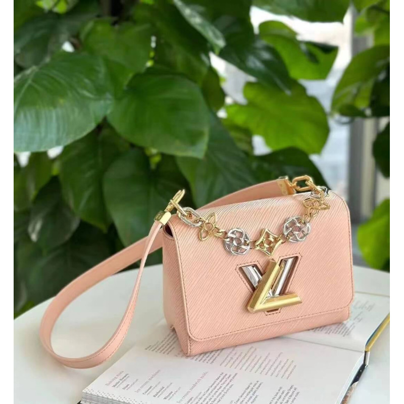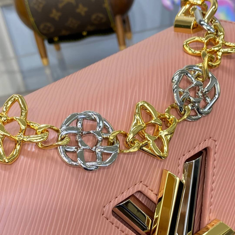 This Twist PM handbag features a gold-and-silver-color chain, adorned with Monogram Flowers delicately twisted so that they become links in the chain. The chain can function as a decorative accessory or be attached to the removable shoulder strap to enable cross-body carry. The signature LV Twist lock also a gold and silver color.