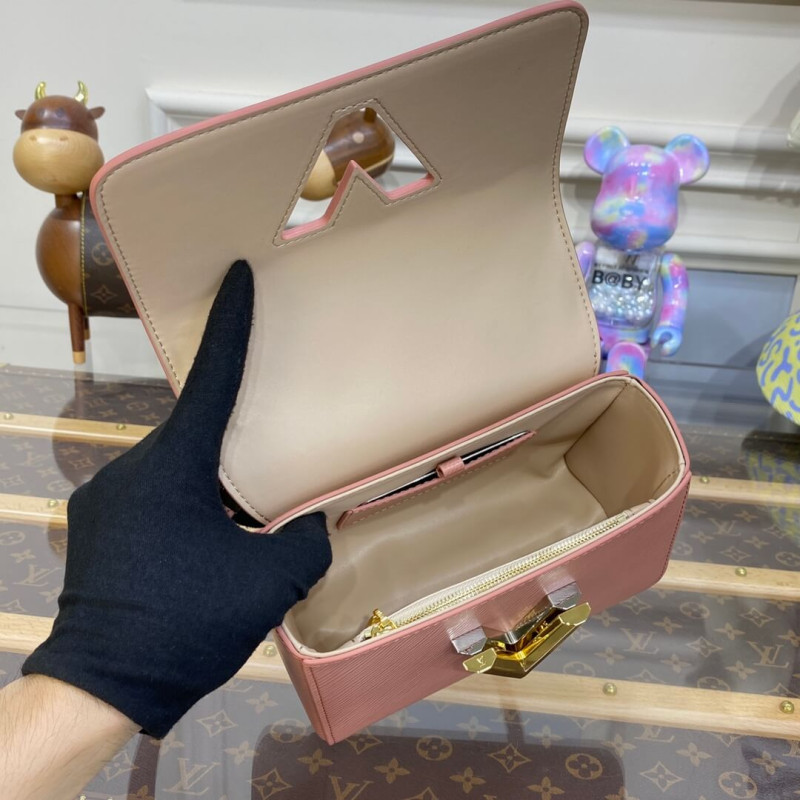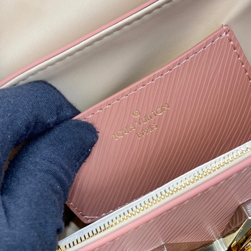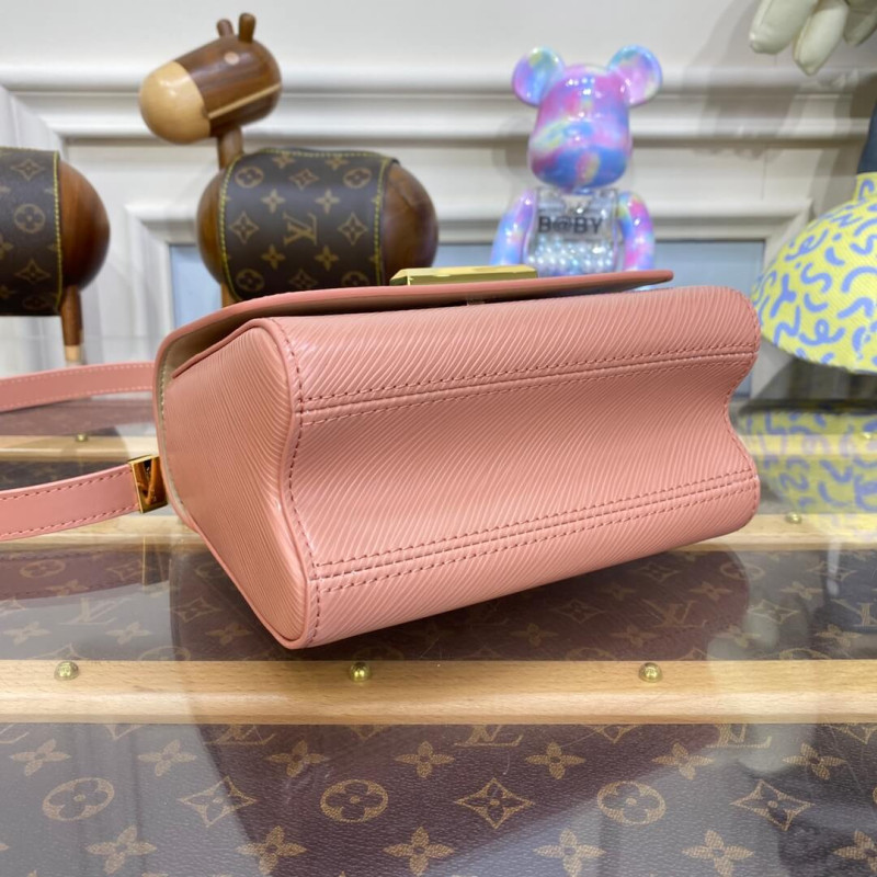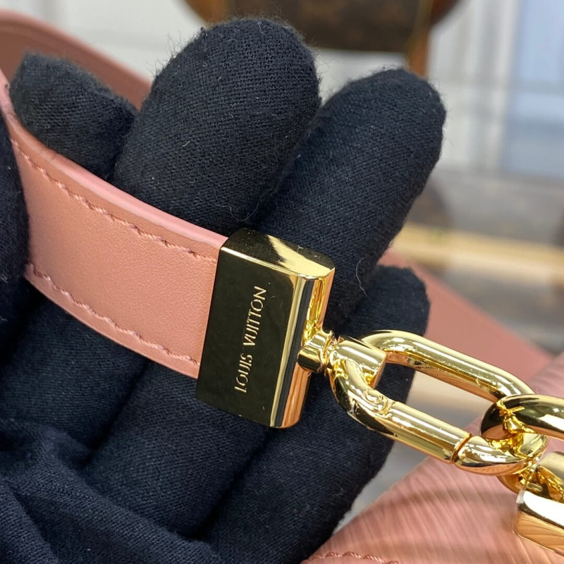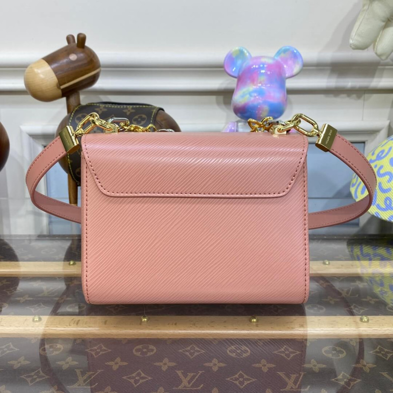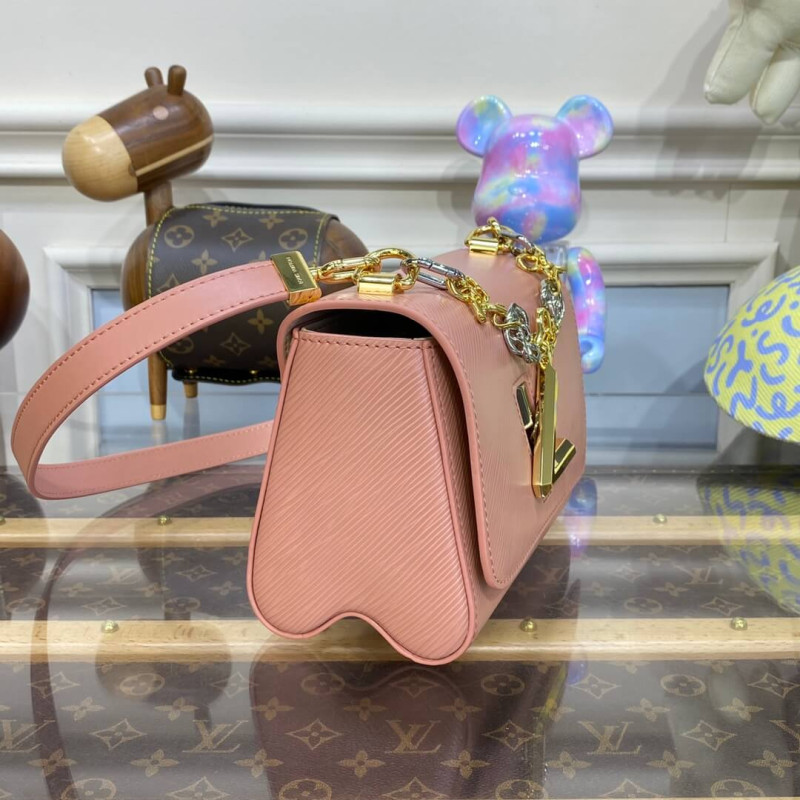 This Twist PM handbag features a gold-and-silver-color chain, adorned with Monogram Flowers delicately twisted so that they become links in the chain. The chain can function as a decorative accessory or be attached to the removable shoulder strap to enable cross-body carry. The signature LV Twist lock also a gold and silver color.