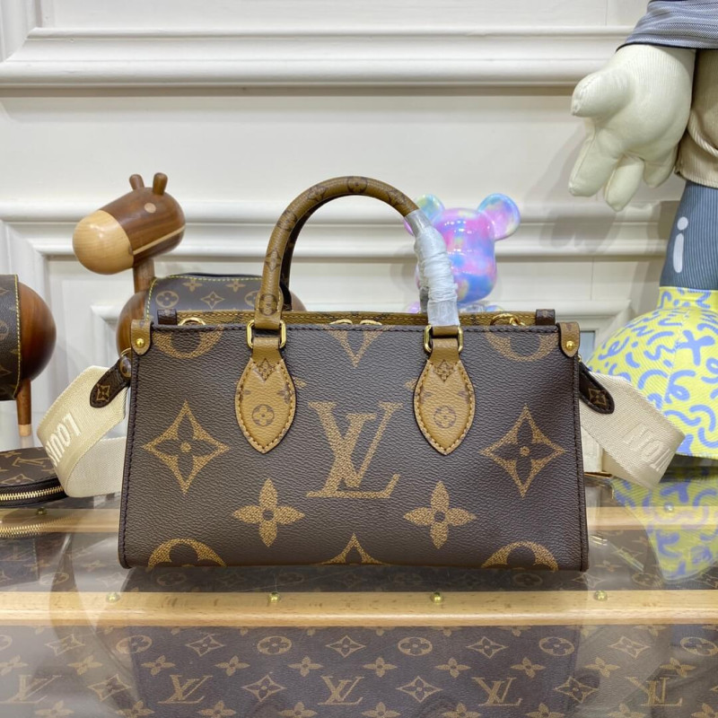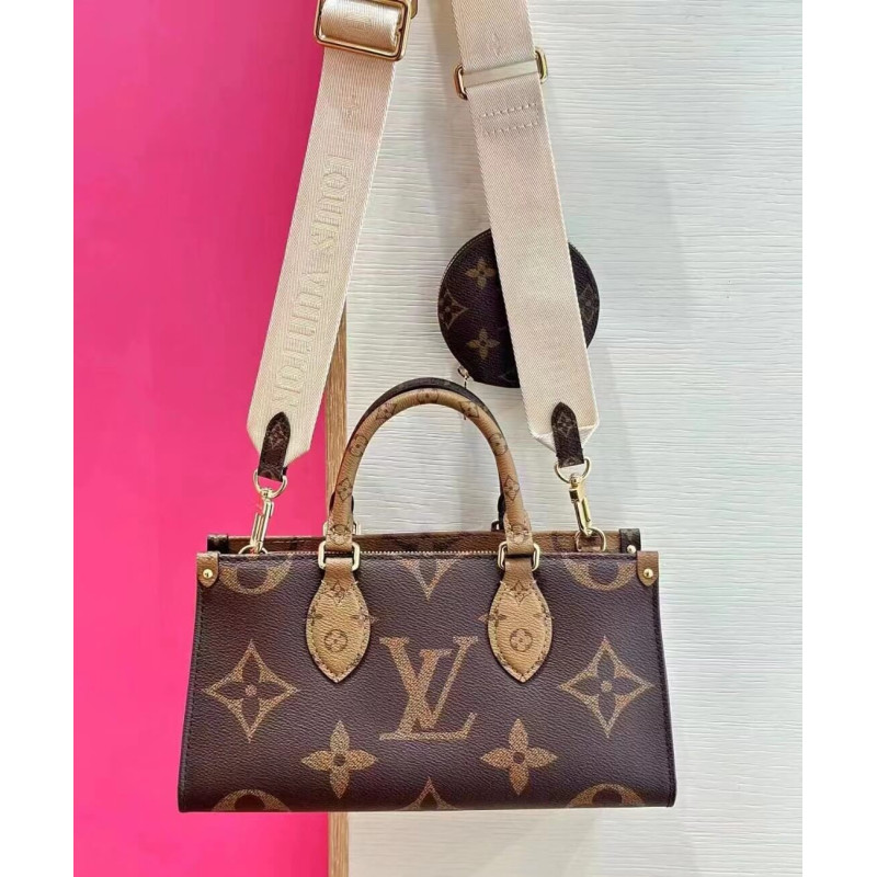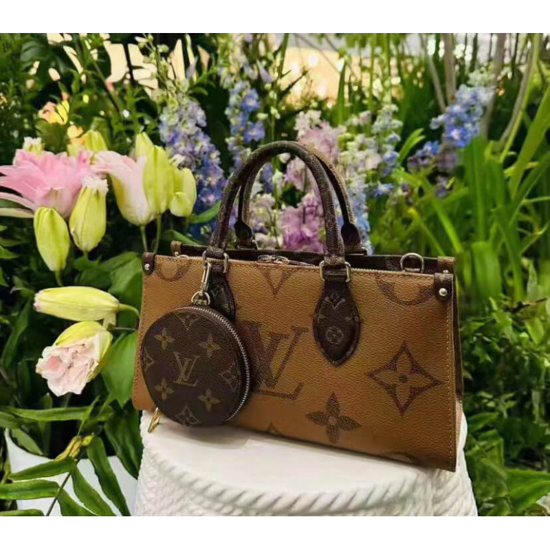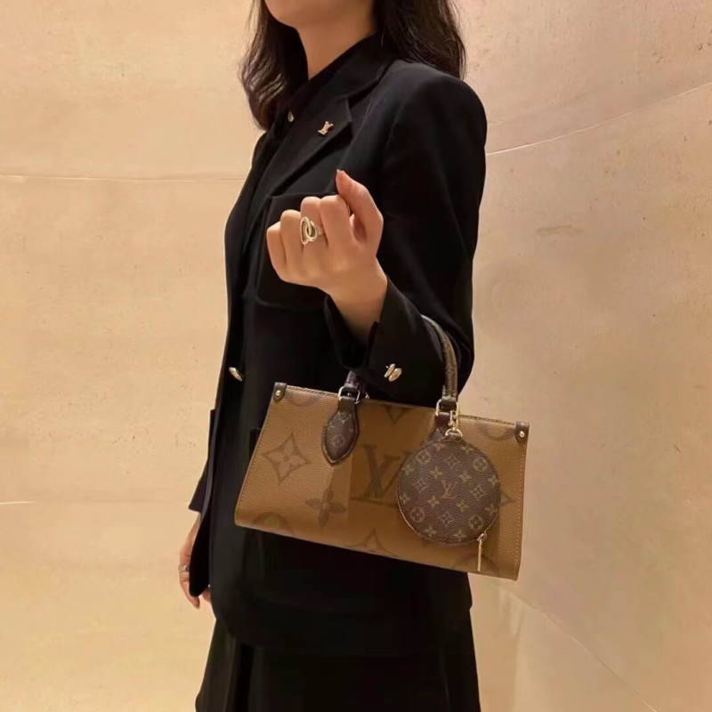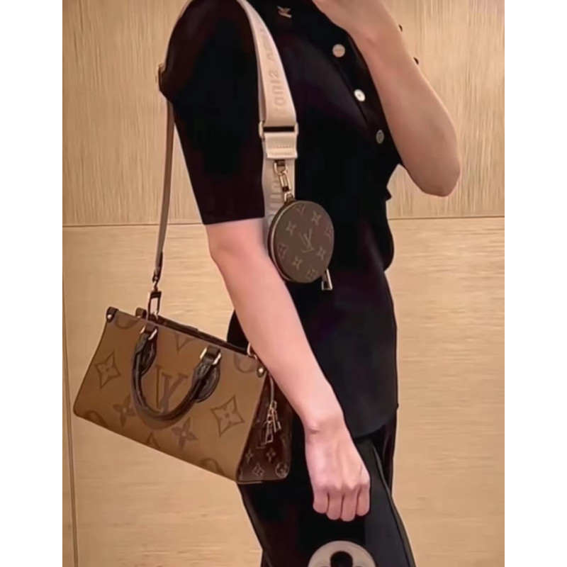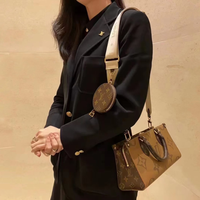 The Maison reinterprets the OnTheGo tote this season with a new east-west shape and a modern mix of Giant Monogram and Monogram Reverse canvas. Fitted with two Toron top handles and a wide, detachable strap, this beautifully proportioned bag can be styled in a variety of ways. A removable round coin purse completes this versatile design.