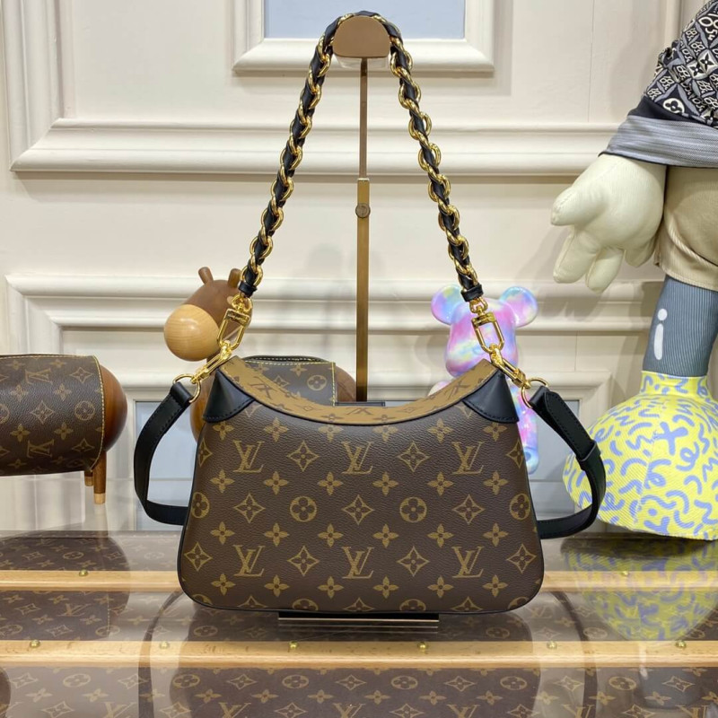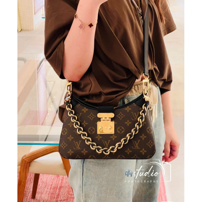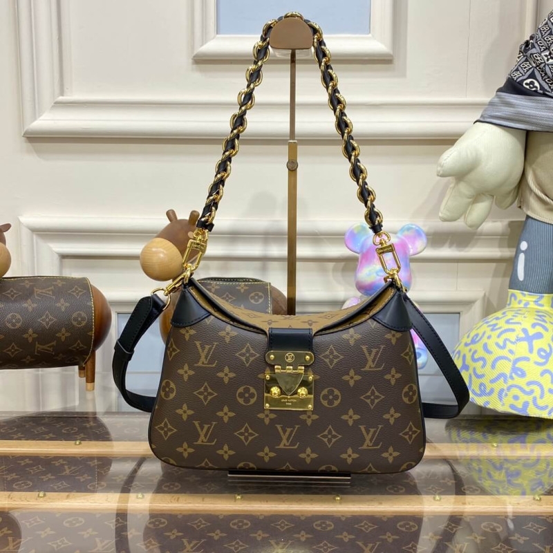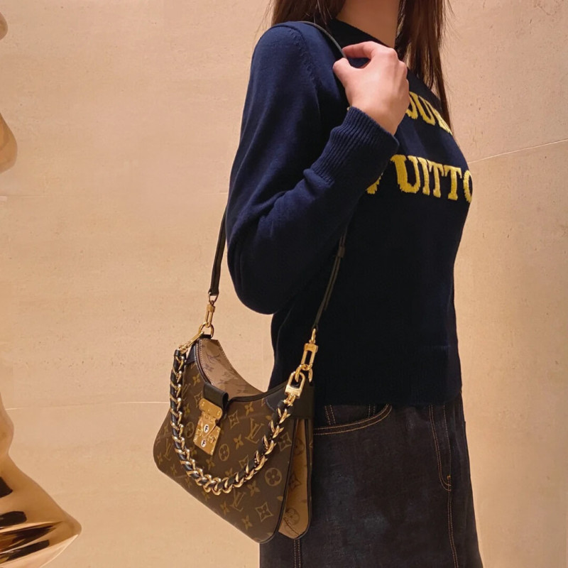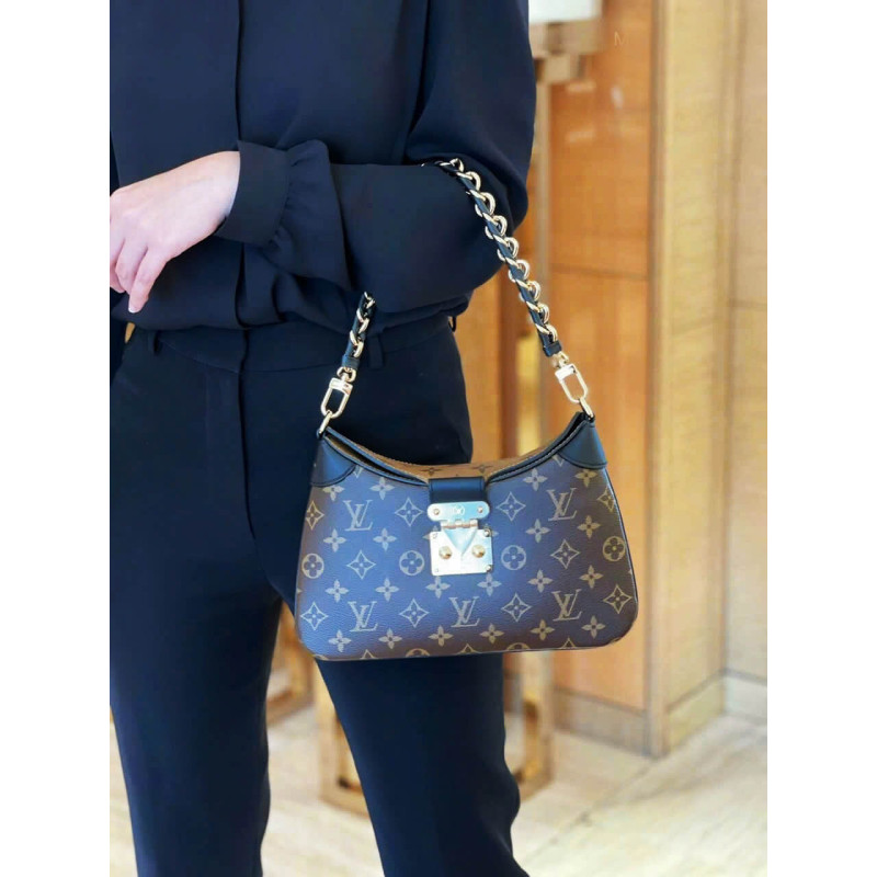 Inspired by the House s archives, the casual yet sophisticated LV Twinny is the Monogram bag of the season. Crafted from a mix of Monogram and Monogram Reverse canvas with black leather trim, it is detailed with an iconic S-lock and a braided chain handle. The bag lends itself to all manner of stylings, from elbow and shoulder to short or long cross-body wear.