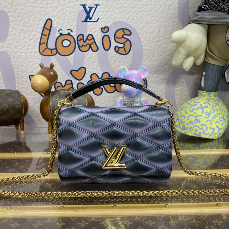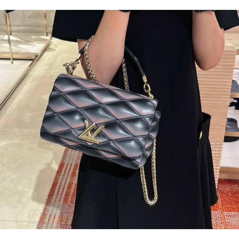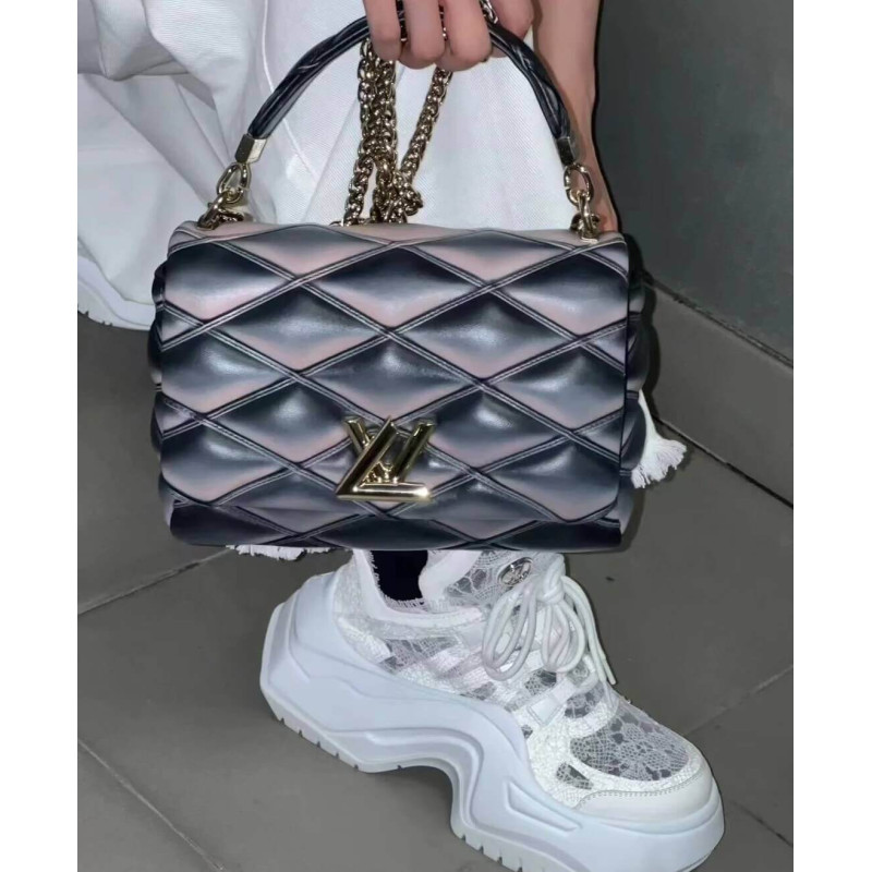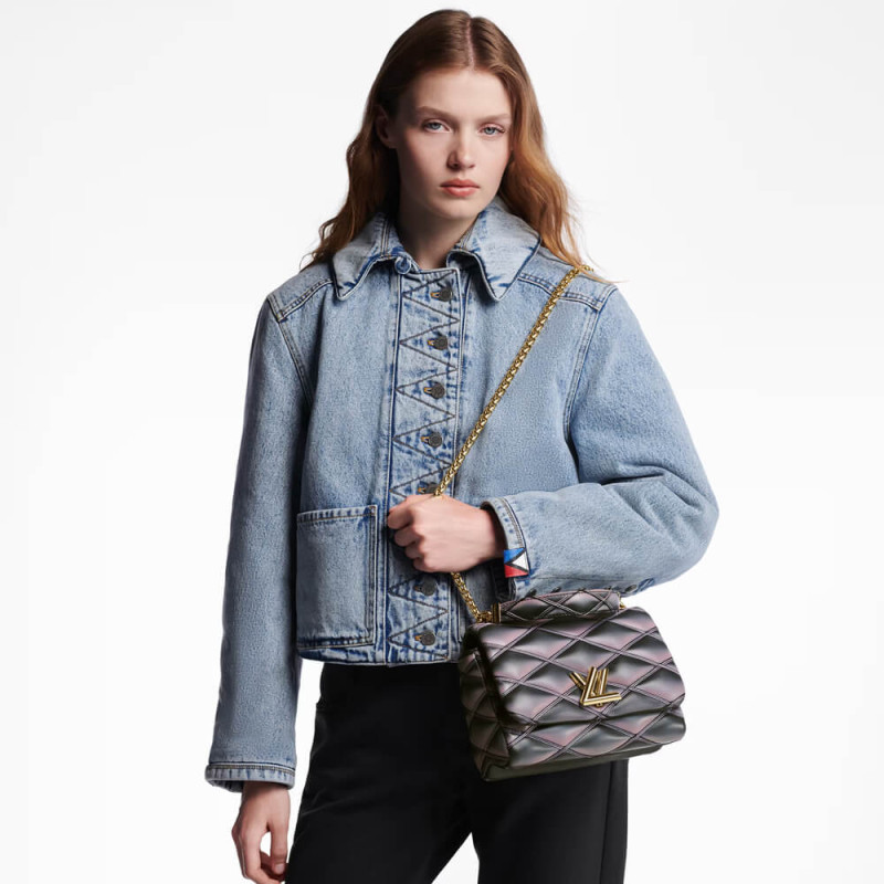 Nicolas Ghesquière explores new techniques to embellish the GO-14 MM handbag. Here padded lambskin is quilted, and a refined toasted effect is applied by hand, giving it an edgy futuristic allure. The top handle and adjustable chain – both detachable – enable carry options. It’s signed with the House’s emblematic LV Twist lock.