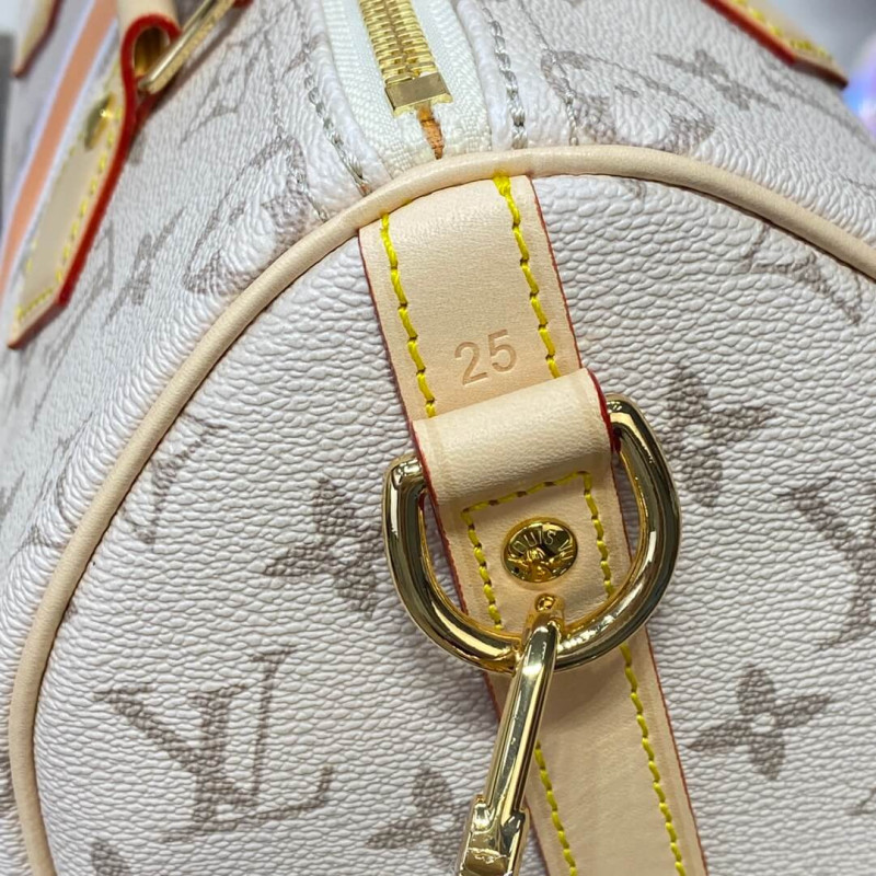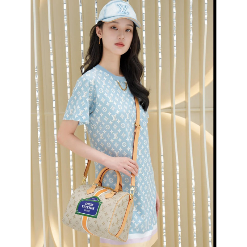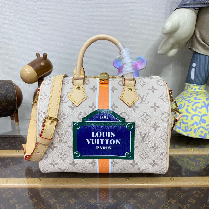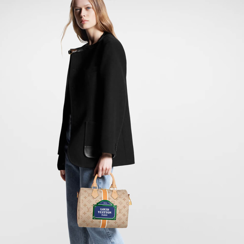 The Speedy Bandoulière 25’s emblematic shape is made from beige Monopaname canvas with a central vertical strip in white, ocher, and white, like those found on the House’s early trunks. In the center “Louis Vuitton Paris” in bold white typeface on a solid blue background is framed in green. Just like a typical Parisian street-sign.