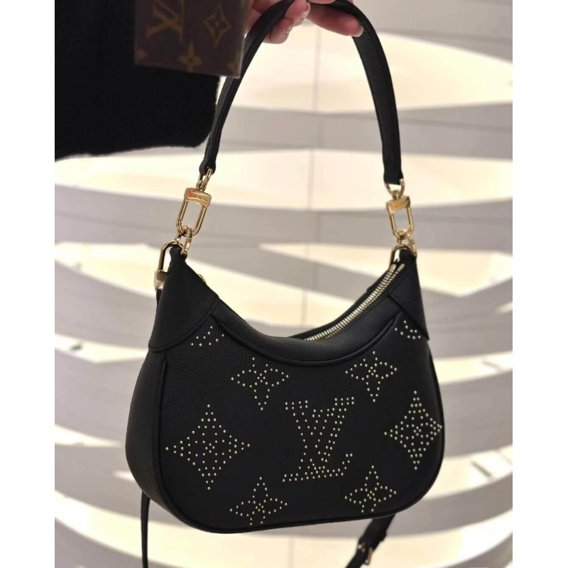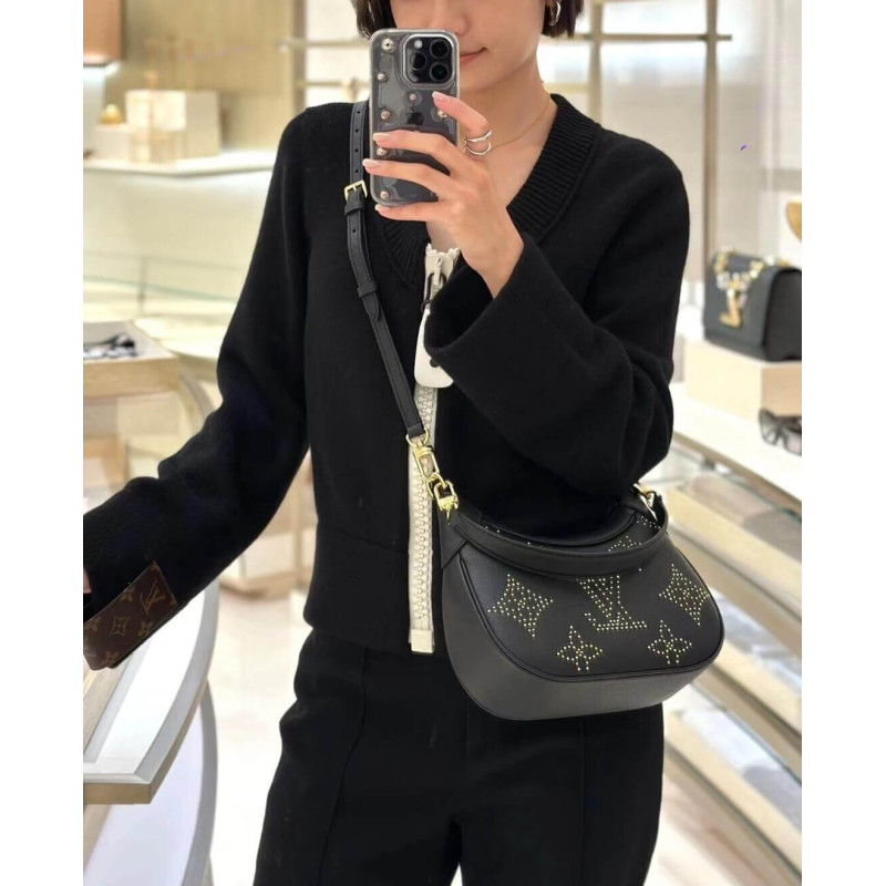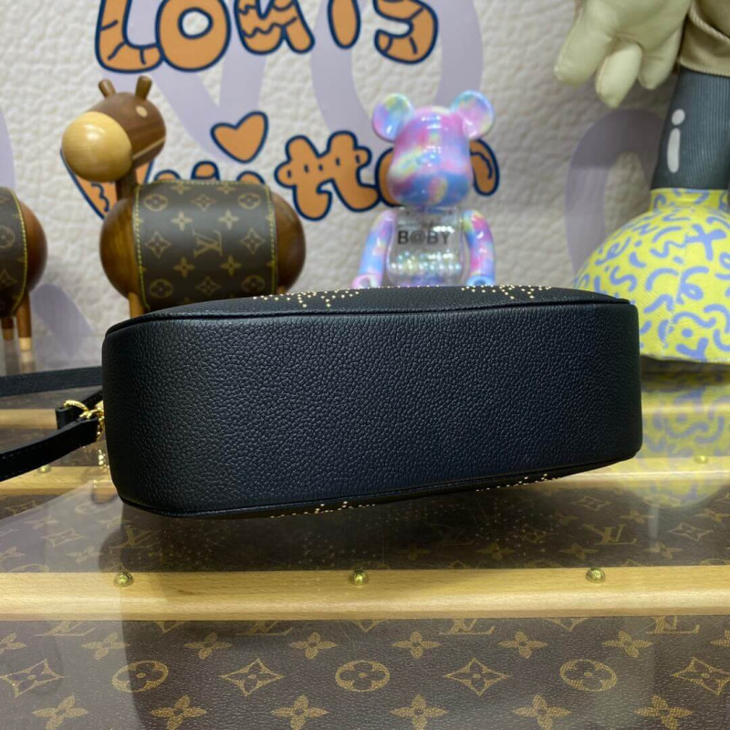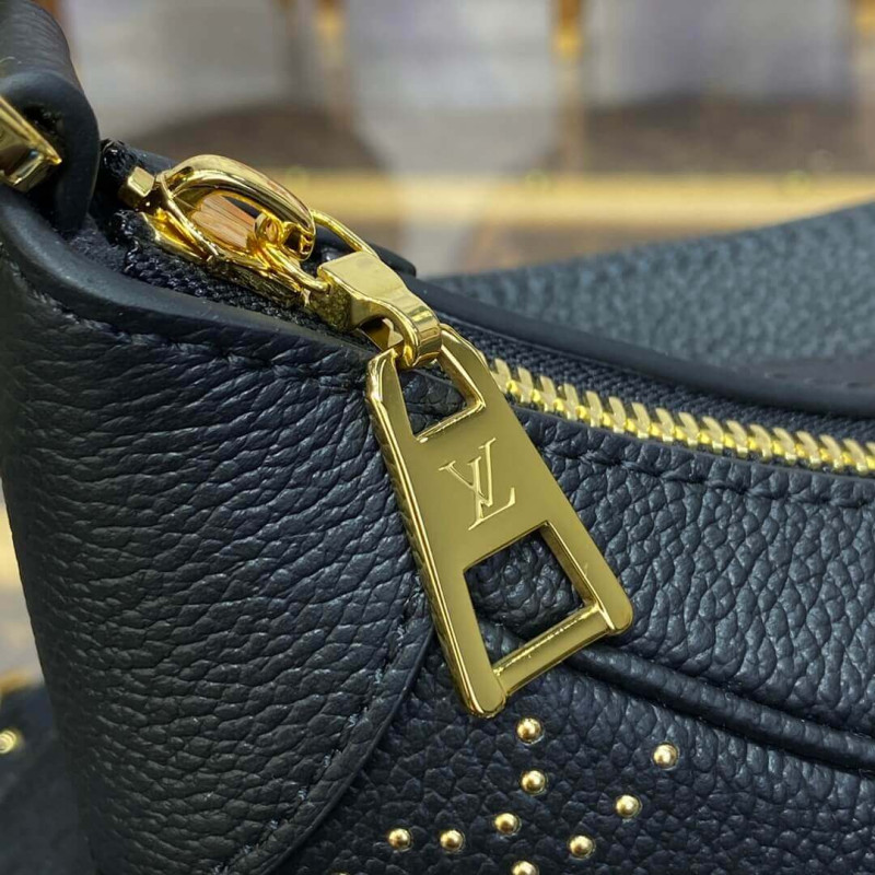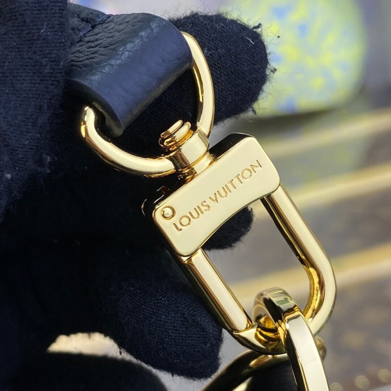This rock-chic version of the Bagatelle handbag is made from Monogram Empreinte leather, with gold-color studs forming the iconic Monogram pattern. The meticulous process of applying the studs is a testament to the House’s craftsmanship. Each stud is coated with 0.25 microns of gold. There’s a removable handle and a detachable and adjustable strap.