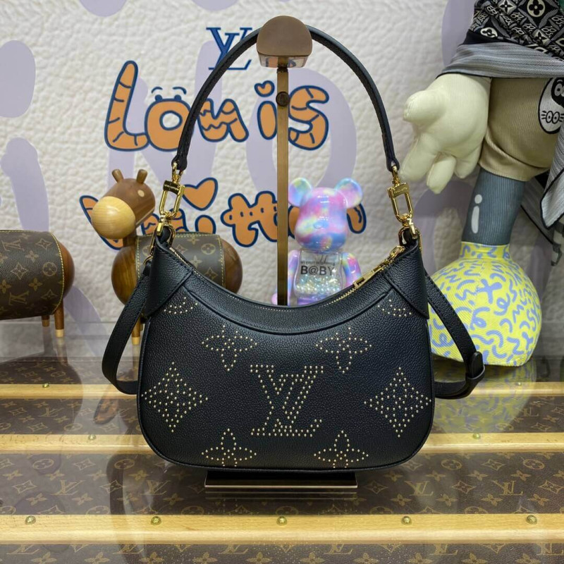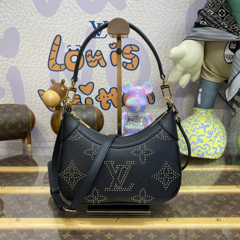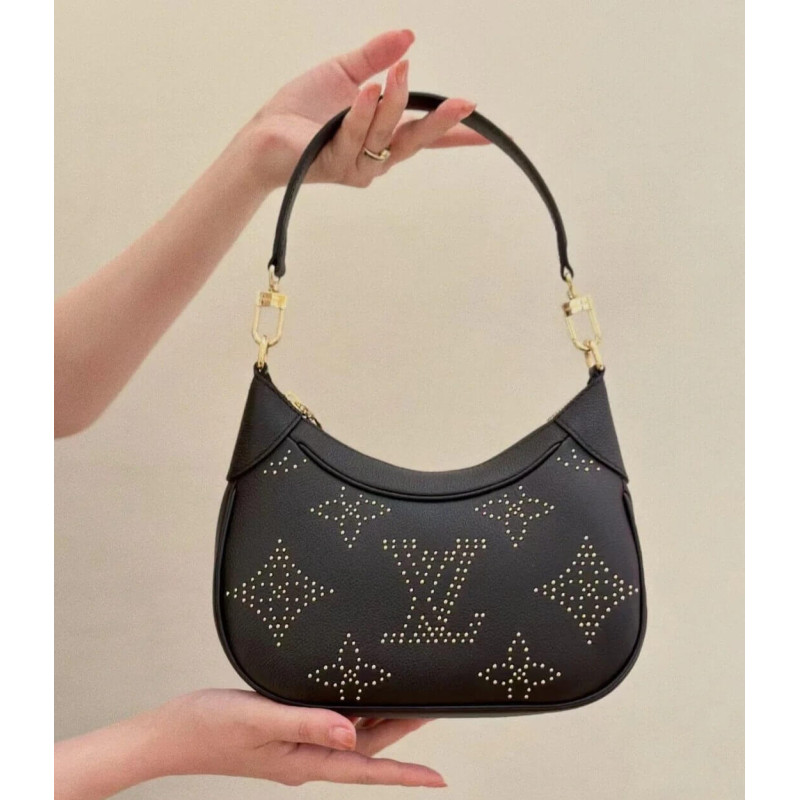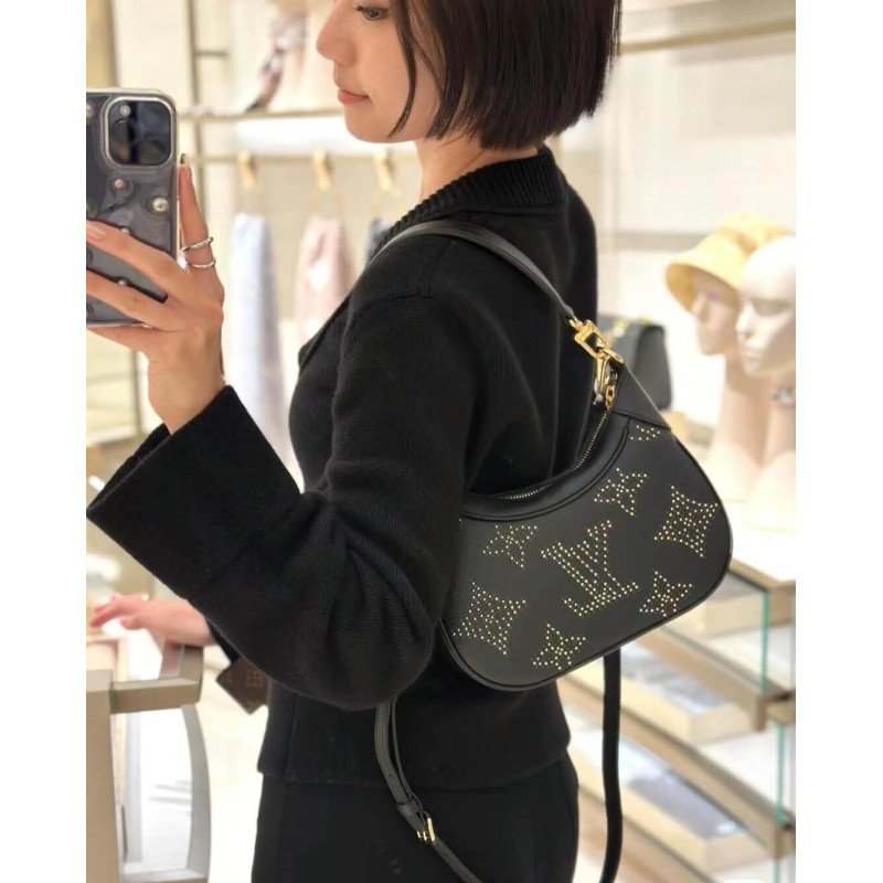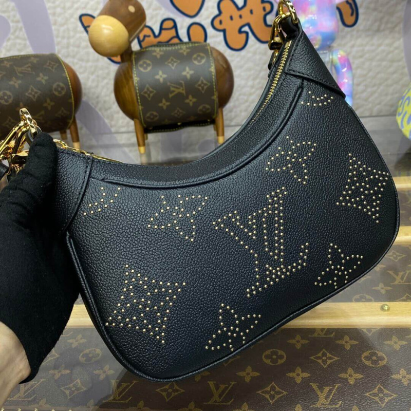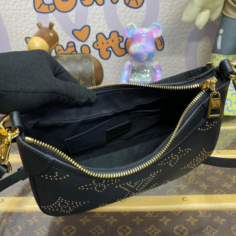 This rock-chic version of the Bagatelle handbag is made from Monogram Empreinte leather, with gold-color studs forming the iconic Monogram pattern. The meticulous process of applying the studs is a testament to the House’s craftsmanship. Each stud is coated with 0.25 microns of gold. There’s a removable handle and a detachable and adjustable strap.