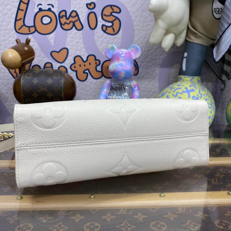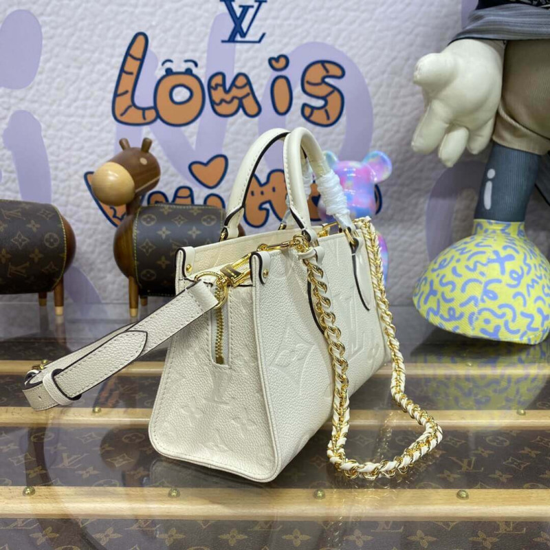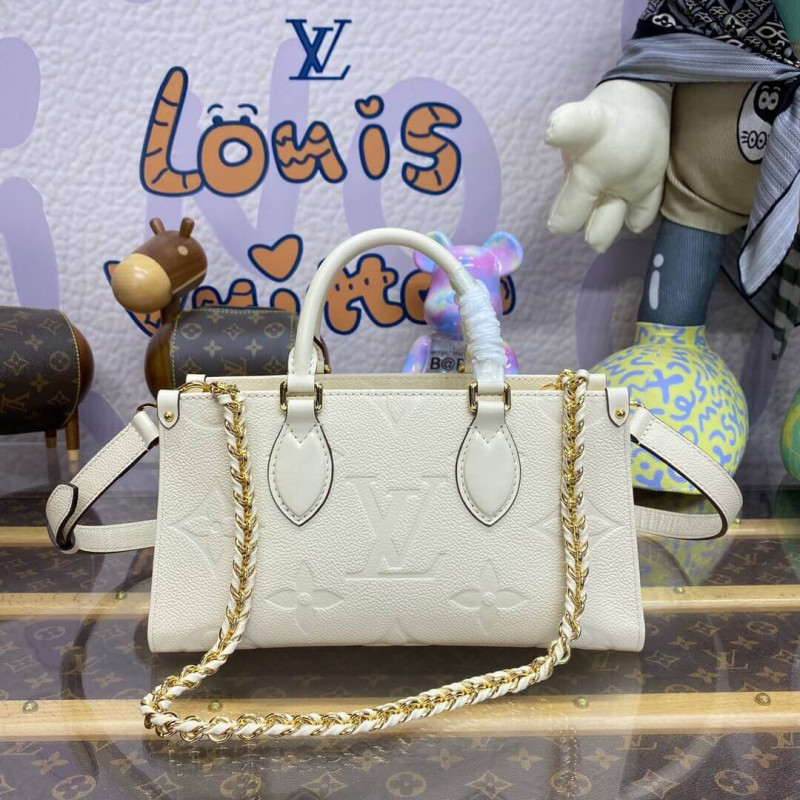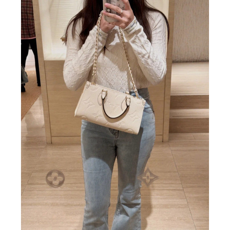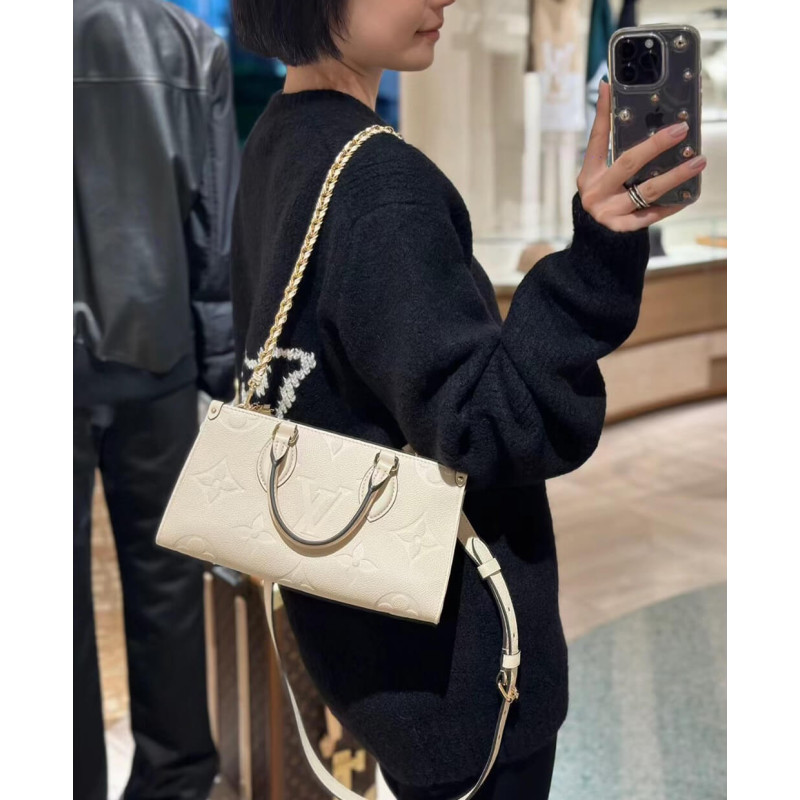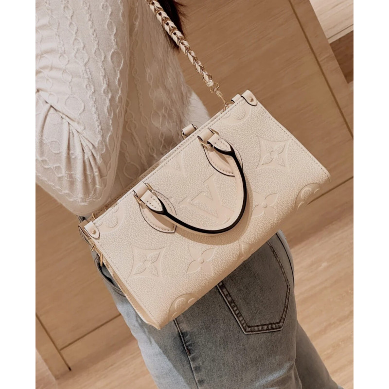 Introducing the OnTheGo East West tote, interpreted in a beautifully proportioned east-west silhouette. Made from Monogram Empreinte leather embossed with a tonal Giant Monogram motif, this compact model boasts a well-organized interior for daily essentials. The bag lends itself to a variety of carry styles, thanks to its two articulated top handles and a removable chain-and-leather strap.- Embossed grained cowhide leather- Grained cowhide-leather trim- Microfiber lining- Gold-color hardware- Large zipped main compartment- Inside flat pocket- 4 riveted corner tabs- Strap: Removable, adjustable- Strap Drop: 35.0 cm- Strap drop max: 53.0 cm- Chain: Removable- Chain Drop: 30.0 cm- Handle: Single x2