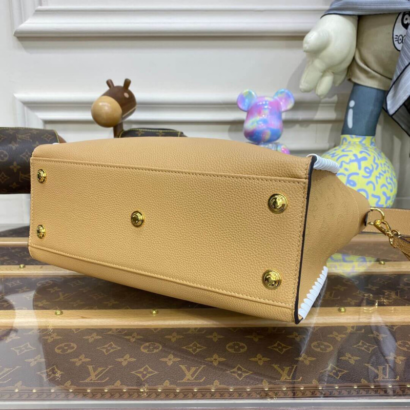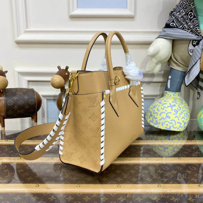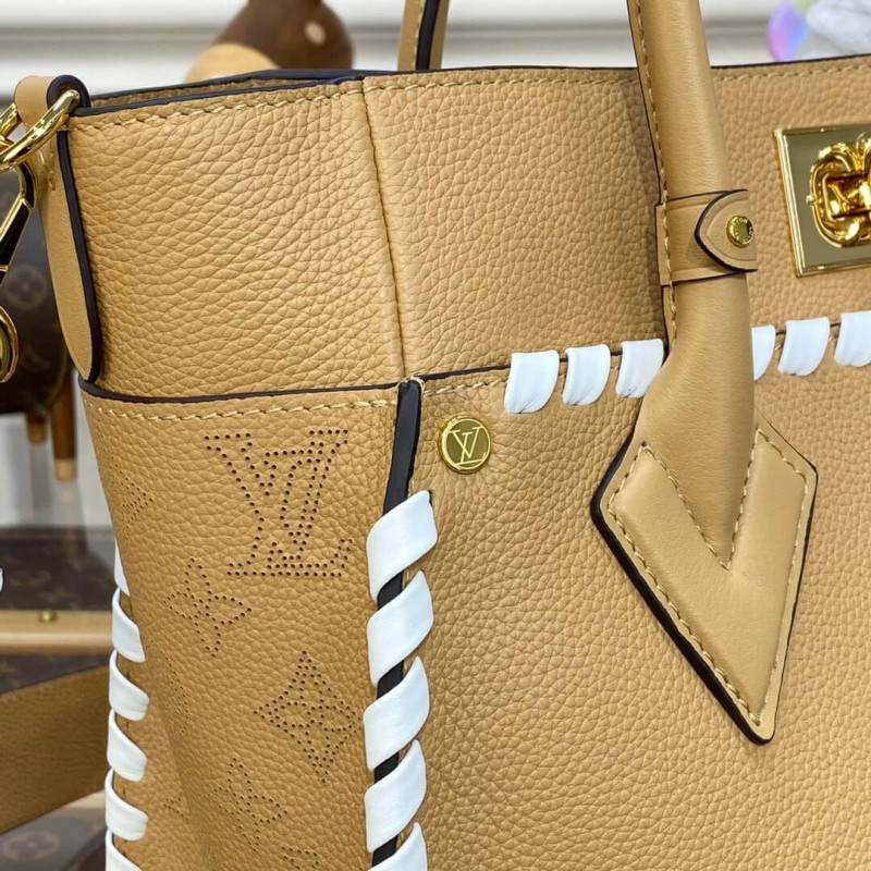 The On My Side MM handbag is made from calf leather, with a perforated Monogram pattern on the sides. Delicate leather braiding, meticulously done by hand, adorns the bag’s front and back, highlighting its structured lines. In addition to the top handles, there’s a wide removable strap, also decorated with braiding.- 30.5 x 24.5 x 14 cm- Calf leather and perforated calf leather- Cowhide-leather trim- Microfiber lining- Gold-color hardware- Hook closure- 2 outside pockets (front and back)- Double smartphone compartments- Zipped pocket- 4 protective metal bottom studs- Strap:Removable, not adjustable- Strap drop: 19.3 inches- Handle:Double