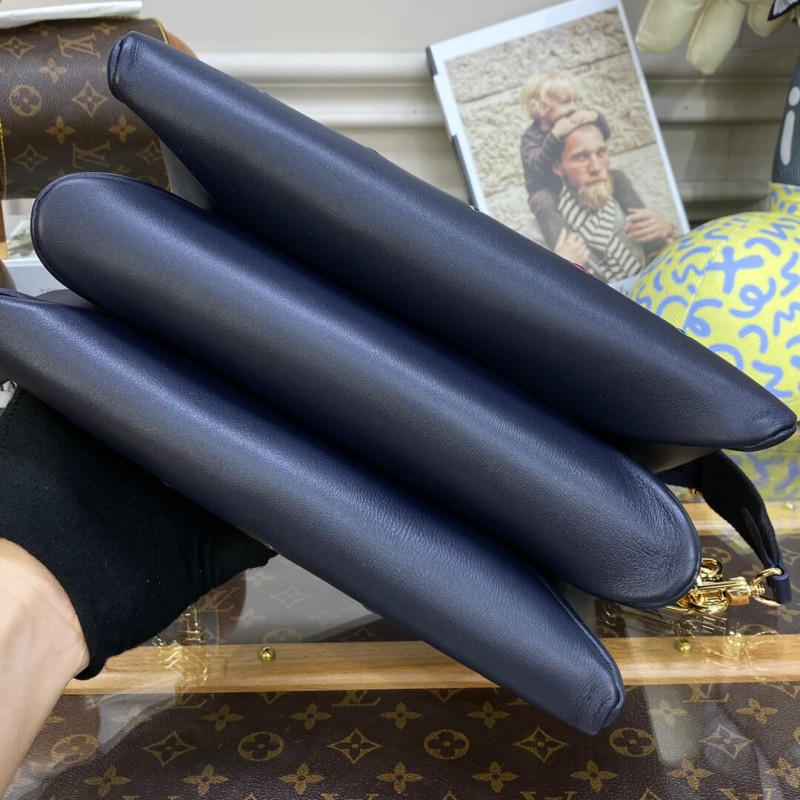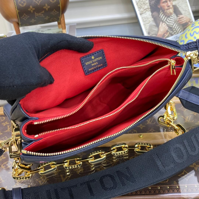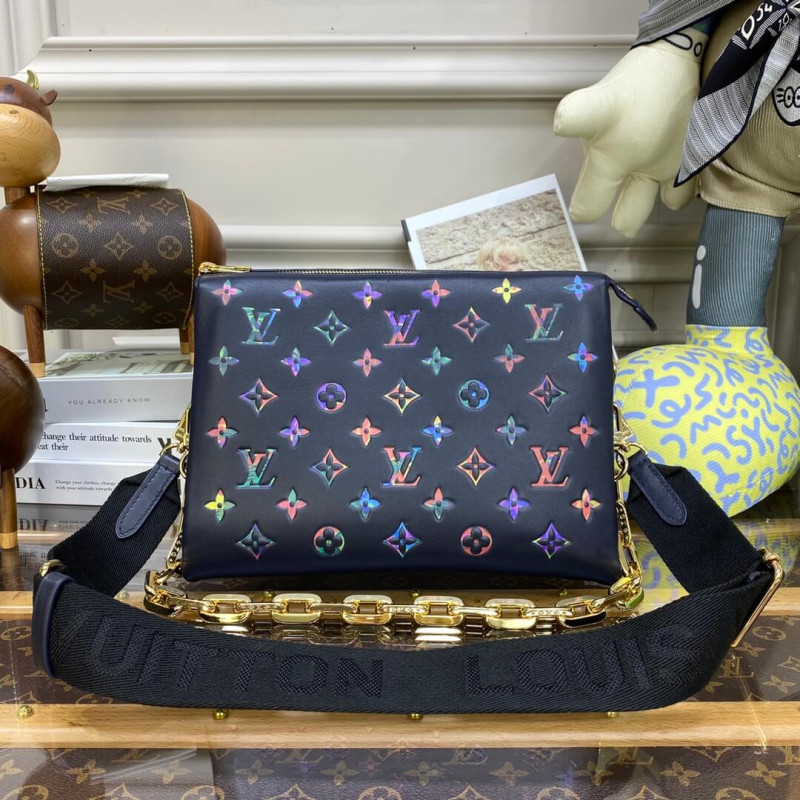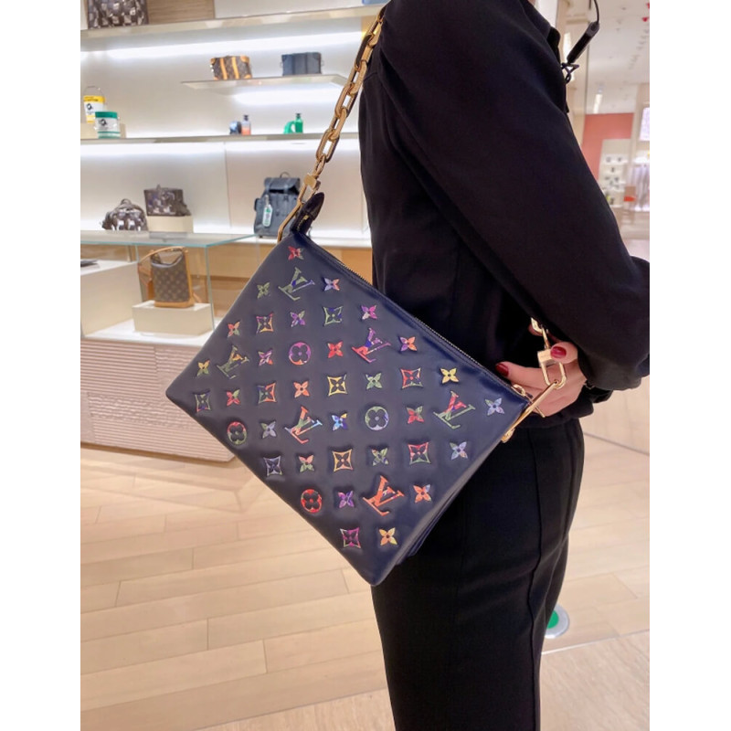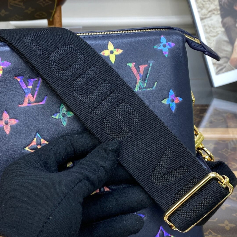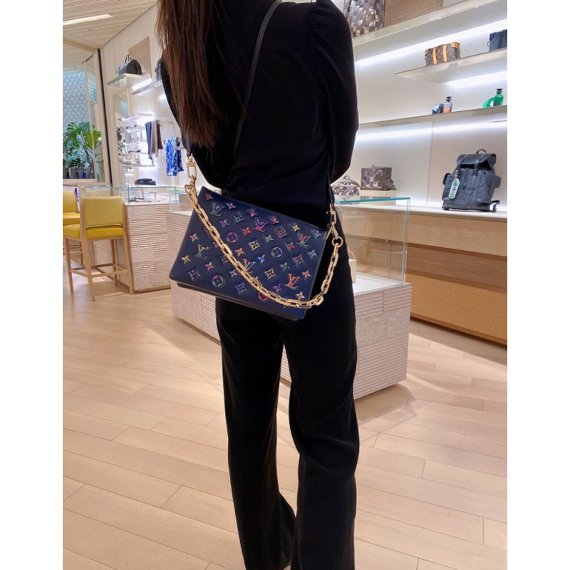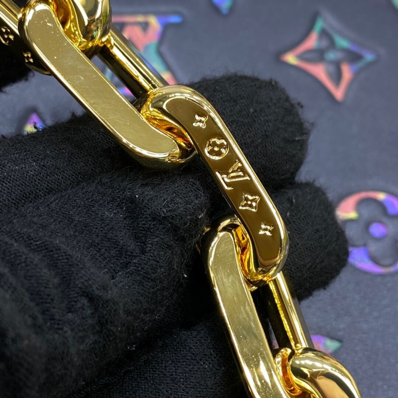 Fashioned from puffy lambskin leather, this Coussin PM handbag is embellished with an embossed Monogram motif with a discreet floral pattern inside the LVs and Monogram Flowers. A chunky chain enables shoulder carry while a wide textile strap, removable and adjustable, can be used for shoulder and cross-body carry.