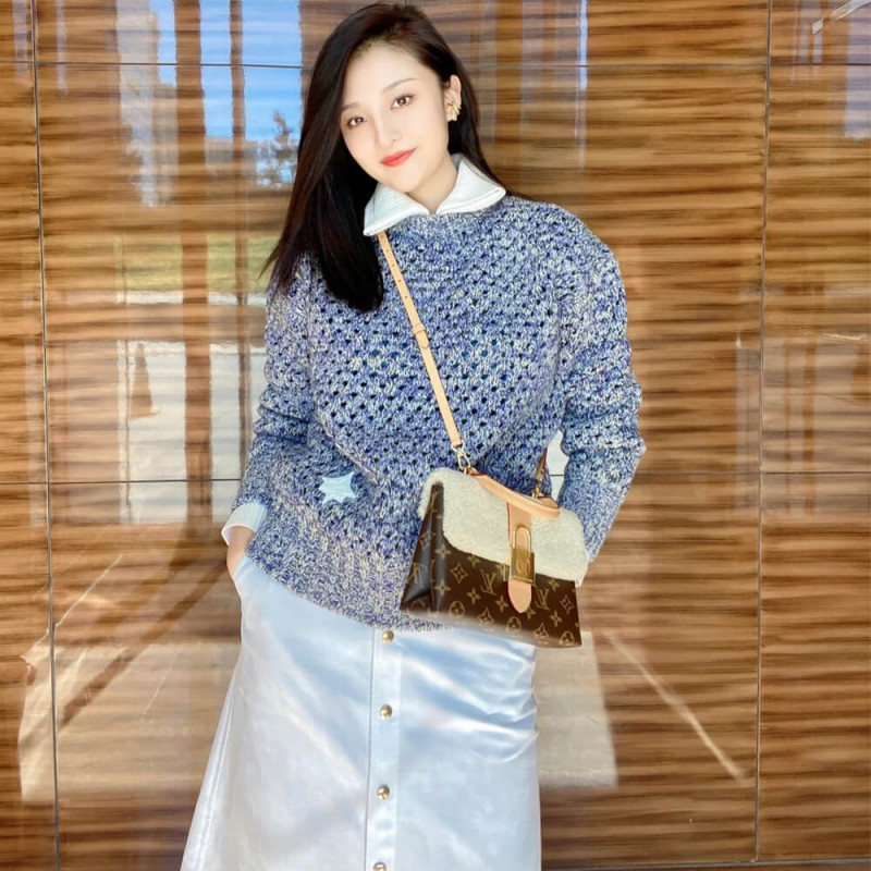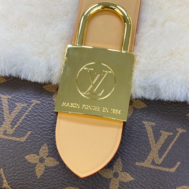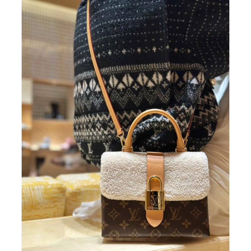 The Cozygram edition of the Locky BB handbag features an eye-catching mix of materials: Monogram canvas combines with soft, cream-colored shearling, accented with an oversized golden padlock, while the top handle and removable strap are crafted from the Maison’s natural aged leather. This day-to-evening piece can be styled in a number of ways, from hand carry to cross-body wear.