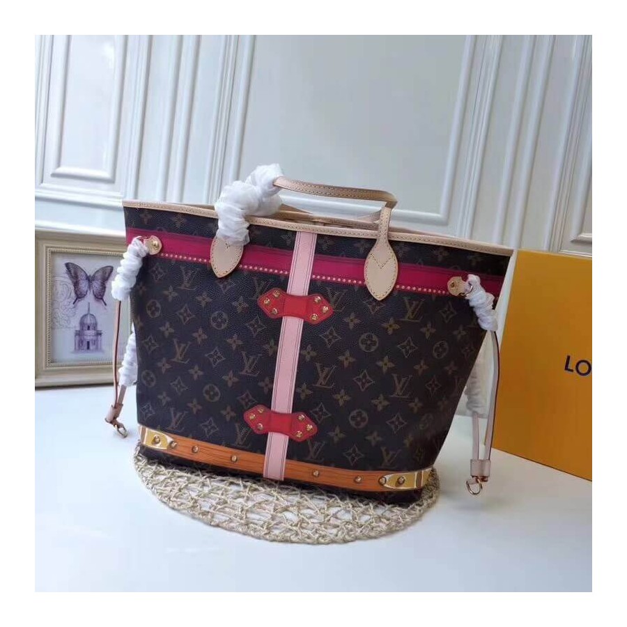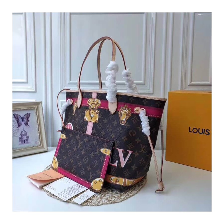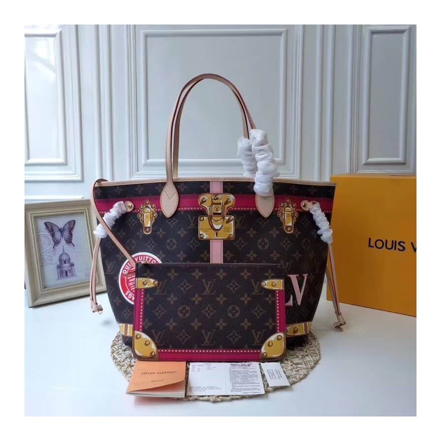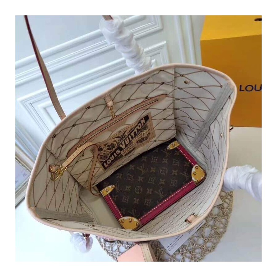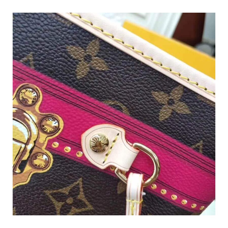 Taking inspiration from the House’s iconic trunks, this Neverfull MM boldly reinterprets Monogram canvas by overlaying screen prints of trunk corners and historic LV locks for a trompe l oeil effect that freshens up this effortlessly practical tote.