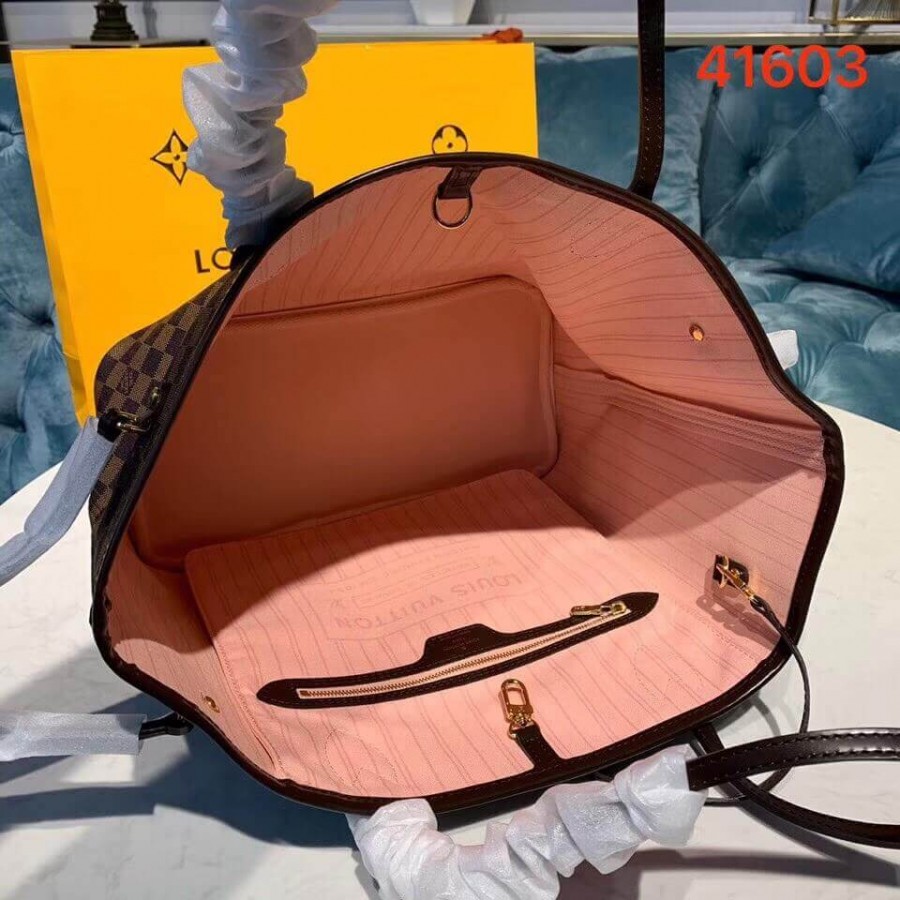 Legendary Neverfull: always exactly what you need it to be. Capacious but not bulky, structured yet supple, at home on the town or in the country. Cinch the side laces, and voilà! it’s a sleek city bag. Loosen them and you have a chic, practical tote. The slim leather handles fit over the shoulder or on the arm. Shown here in Damier Ebène canvas.