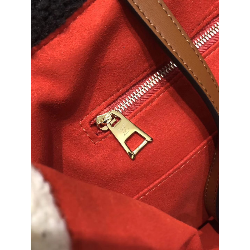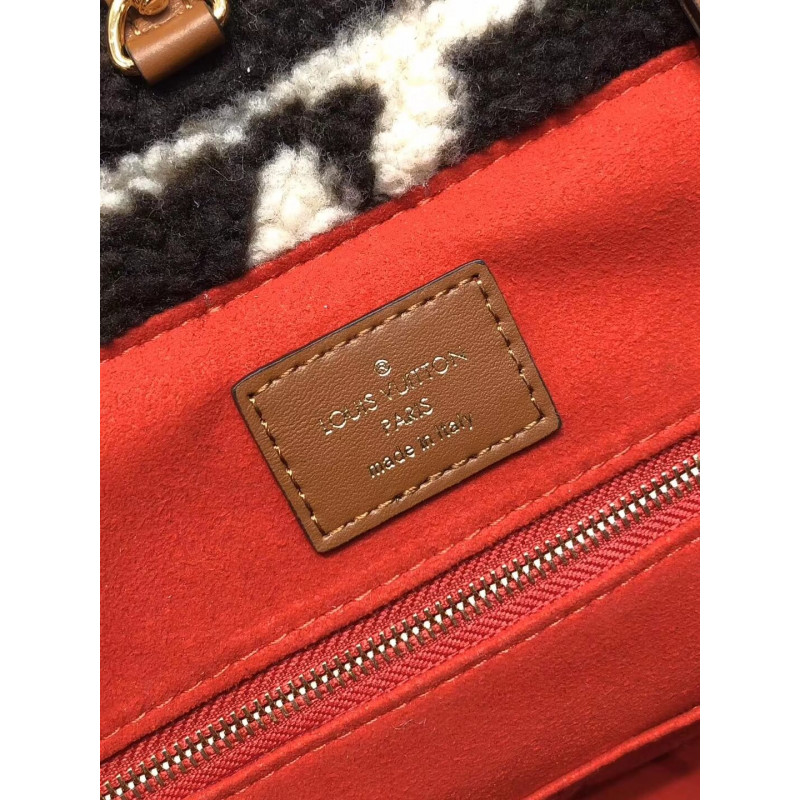 The Onthego GM tote bag is revisited in super-soft shearling as part of the Monogram LV Teddy special edition. An intricate intarsia technique is used to recreate the iconic Monogram pattern. The result is a fluffy look and a cozy feel for this spacious, modern bag, which can be carried in several different ways.