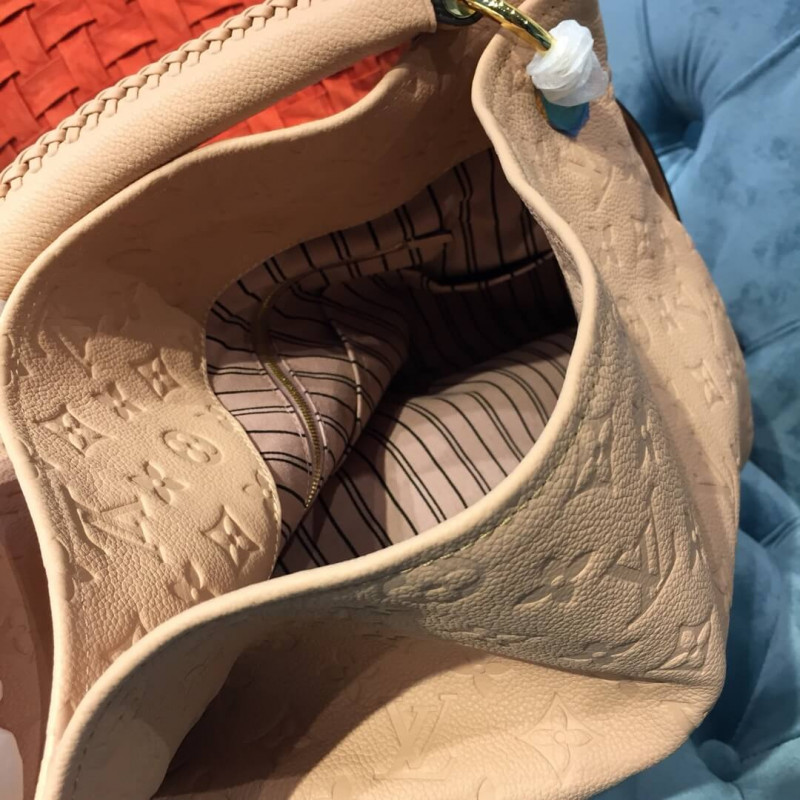 The Artsy MM handbag delights with its refined craftsmanship and functional features. Made from extra-supple Monogram Empreinte embossed leather, this quietly luxurious hobo features a handmade, cross-stitched handle that slips easily over the shoulder. Beautifully detailed with gleaming golden hardware (note the engraved eyelets, D-ring and key holder), it opens to reveal a roomy, cleverly organized interior.