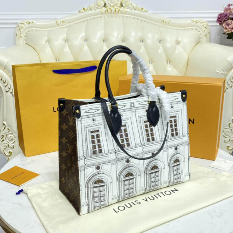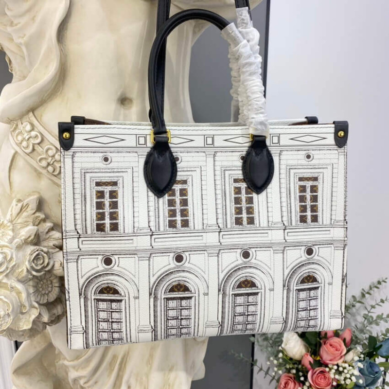 Part of the season’s LVxFornasetti capsule, this striking OnTheGo MM Architettura tote is crafted from printed matte calfskin, with Monogram canvas trim. The smooth leather mimics stone, upon which imaginary buildings are drawn in the signature Fornasetti manner. Fashion and function combine in this roomy carryall, ideal for office or city wear.