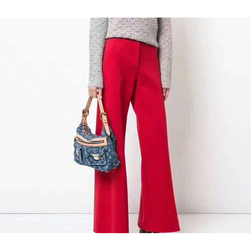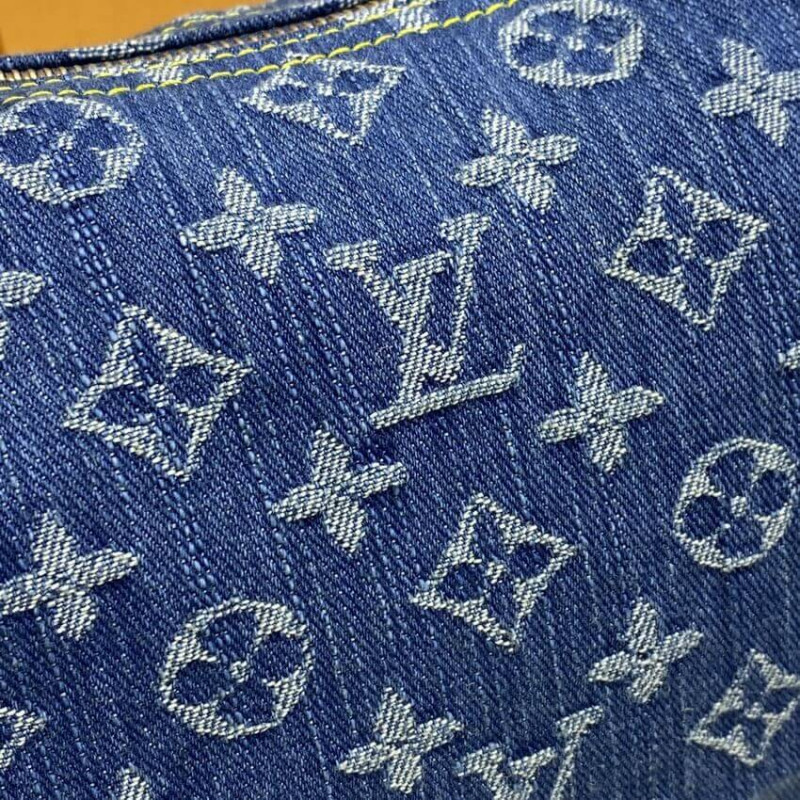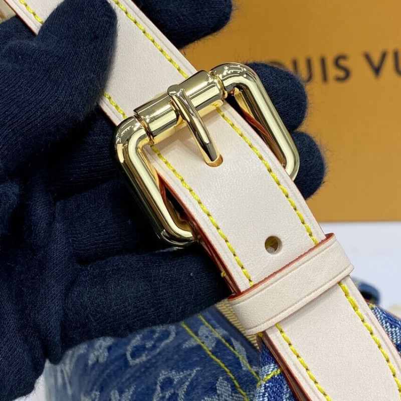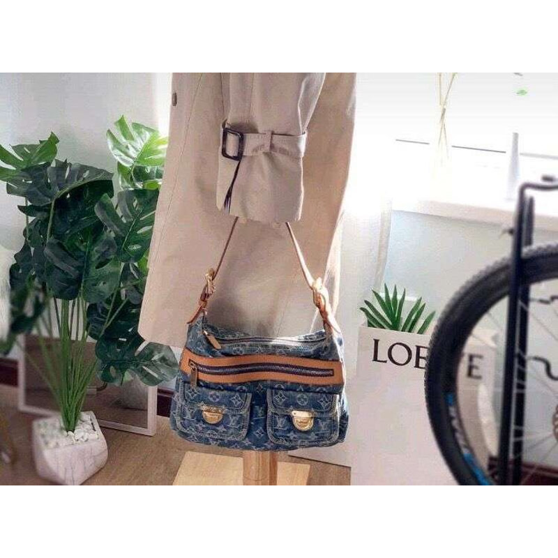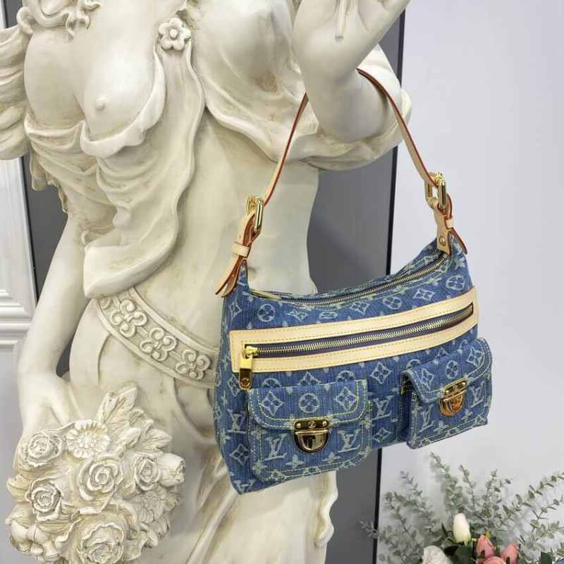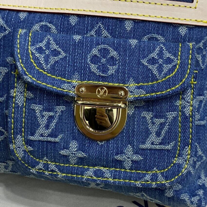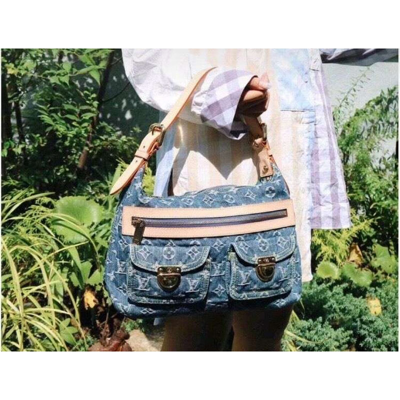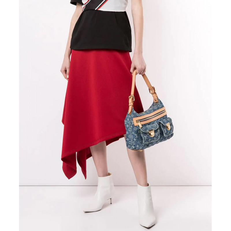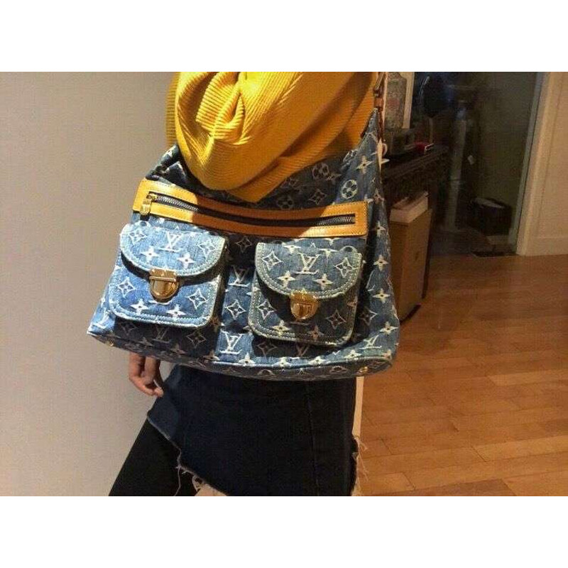 This chic shoulder bag is crafted of aged blue Louis Vuitton monogram denim. The handbag features a vachetta adjustable leather shoulder strap and trim with two front pockets complemented with polished brass push locks. The top zipper opens to a saffron yellow microfiber interior with a patch pocket.