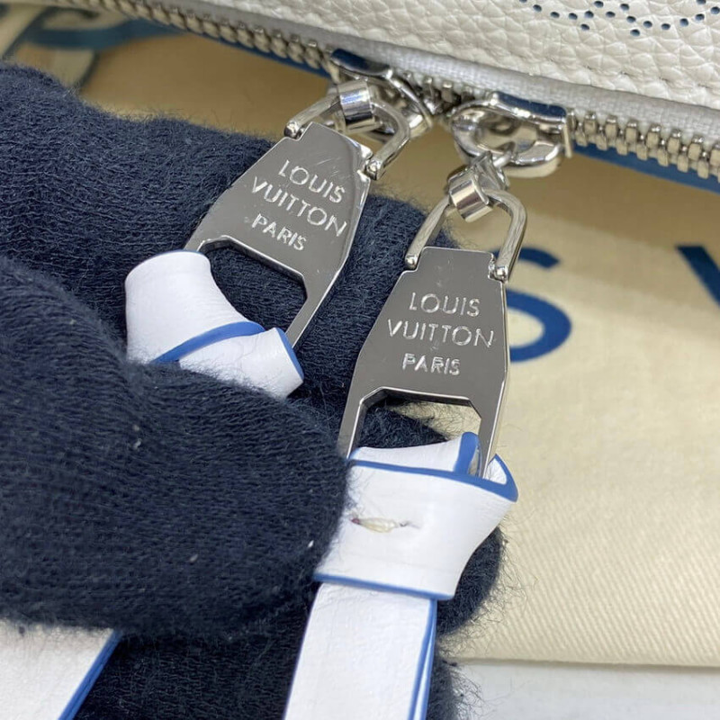 The Beaubourg Hobo bag is fashioned from Mahina leather in which the holes are partly colored by hand, creating a perforated Monogram pattern in blue, red, and caramel. It has a braided-leather top handle for hand or elbow carry and removable strap for shoulder or cross-body carry. A large LV charm signs the bag.