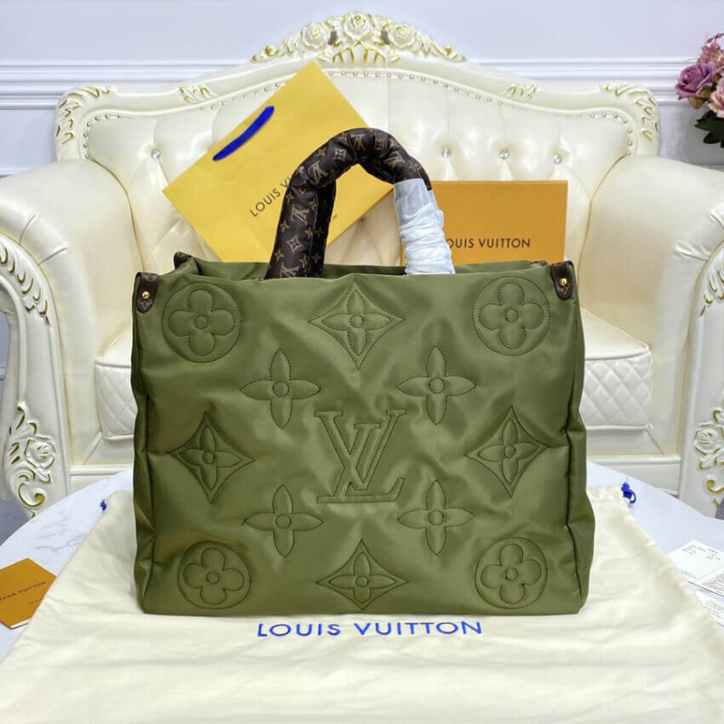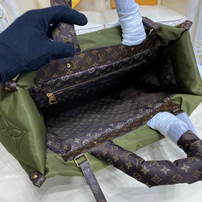 Fashioned from Econyl regenerated nylon, this OnTheGO GM tote bag is a testament to Louis Vuitton’s EcoDesign mindset. The Econyl is embroidered with the Monogram pattern for a padded, sporty-chic feel. This spacious tote is perfect for business, shopping or travel. Long shoulder straps and two top handles permit comfortable carry options.