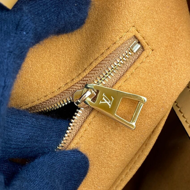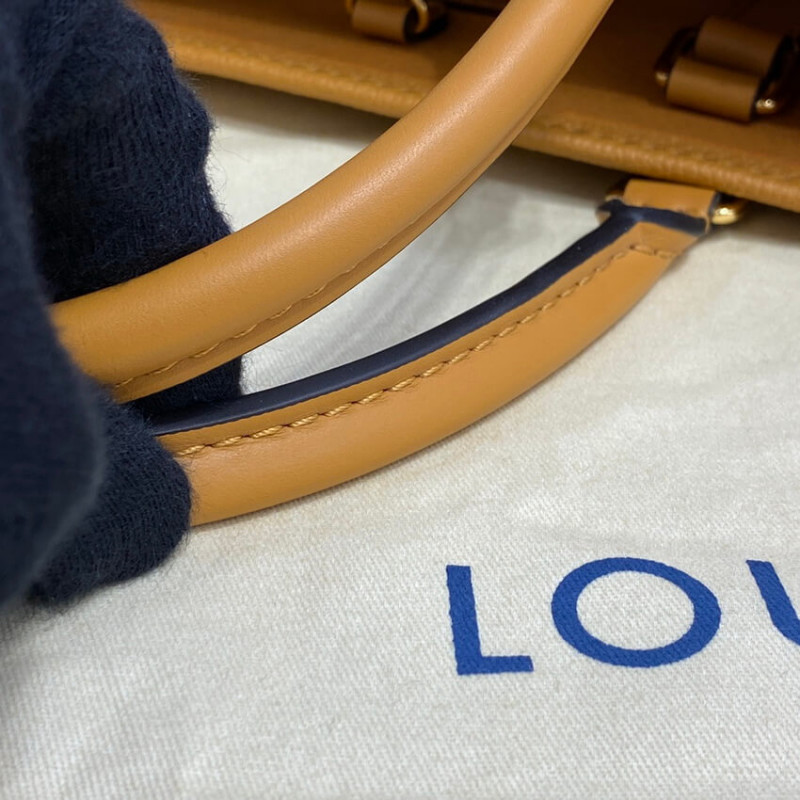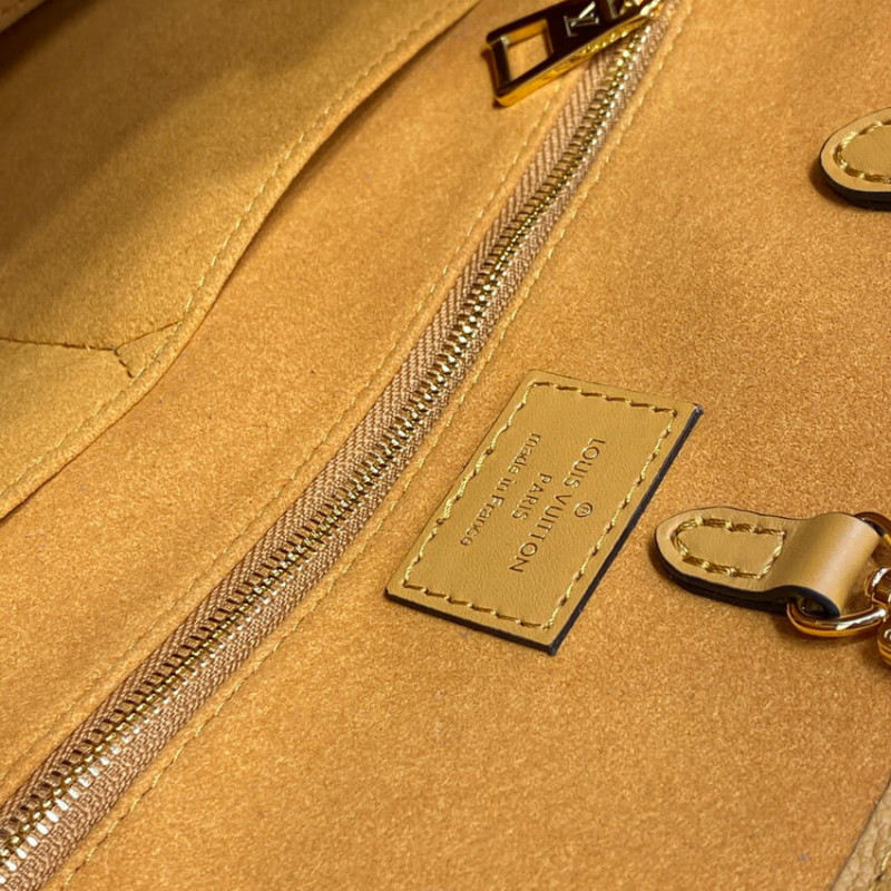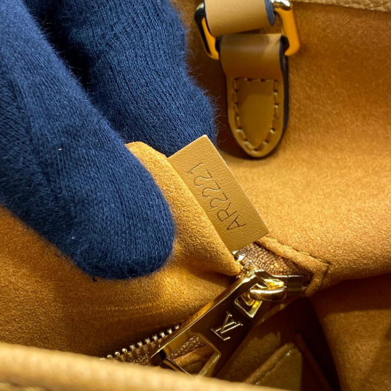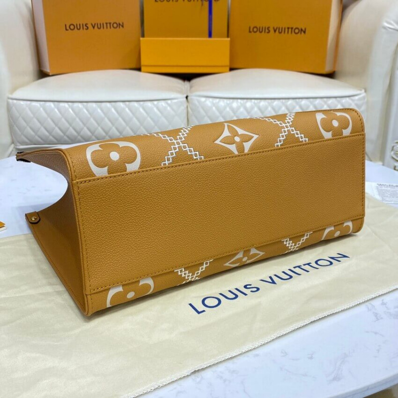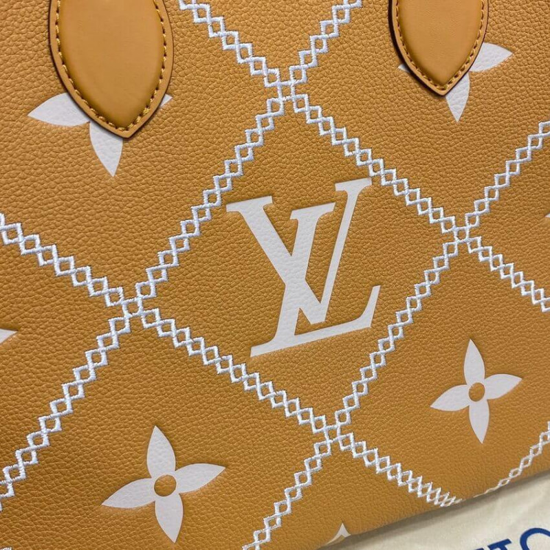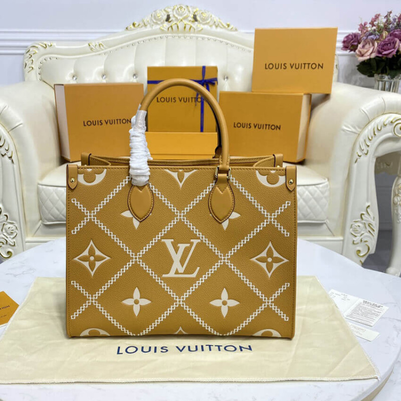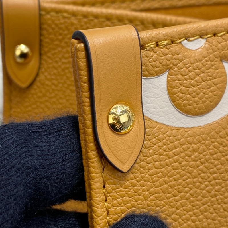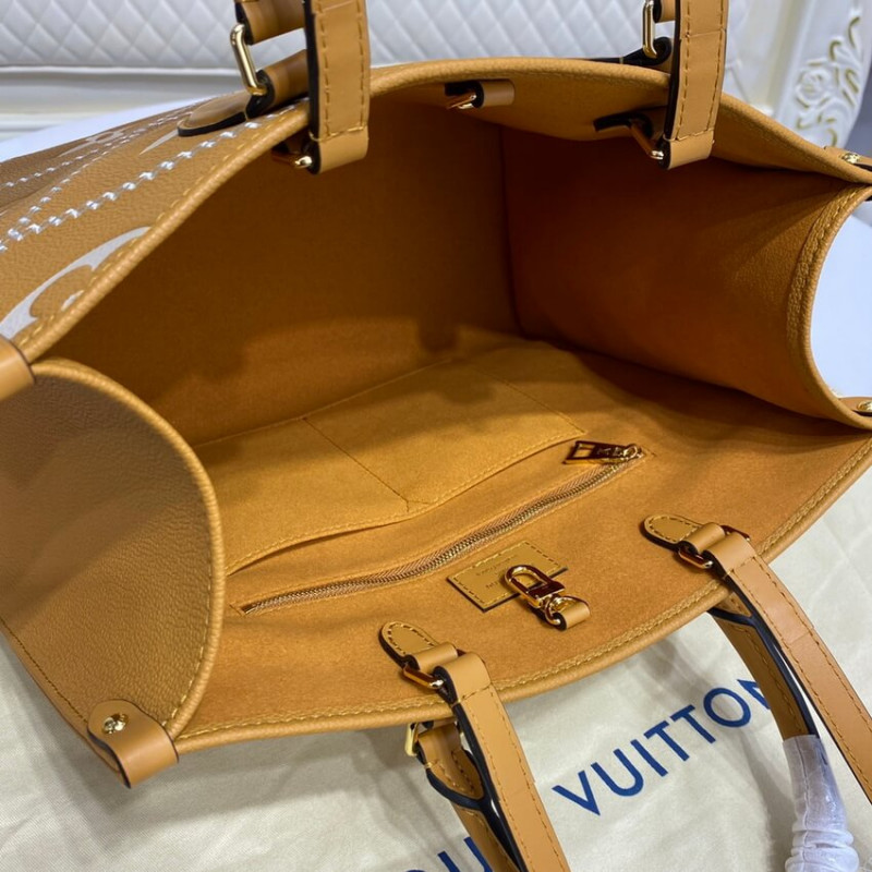 Beautiful, new Louis Vuitton Onthego MM tote bag in cream and black with black microfiber lining and gold-color hardware. Monogram Empreinte embroidered and embossed supple grained leather with a double handle, interior double pockets and and interior zip pocket.