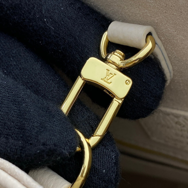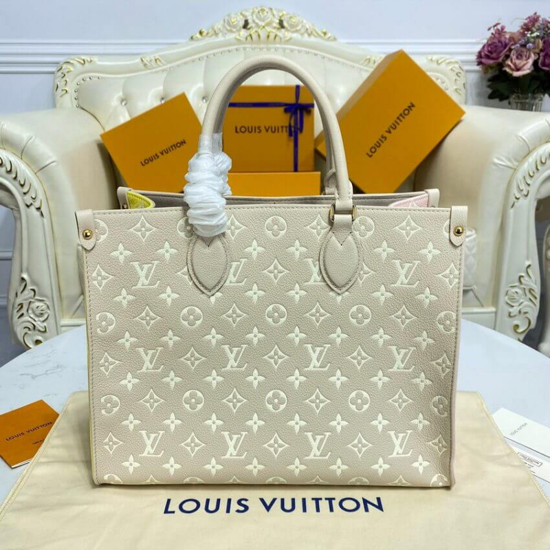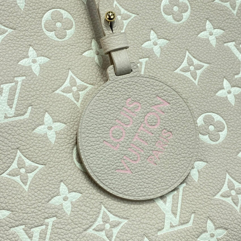 The OnTheGo tote bag is made from Monogram Empreinte cowhide leather, featuring the Monogram pattern on different-colored leathers. The classic Monogram motif is first embossed, then printed on the leather. This is a roomy bag and can easily fit a laptop. Its two sets of handles, short and long, give carry options.