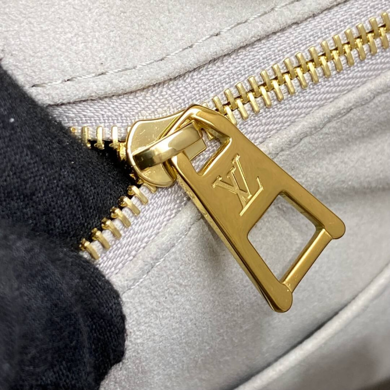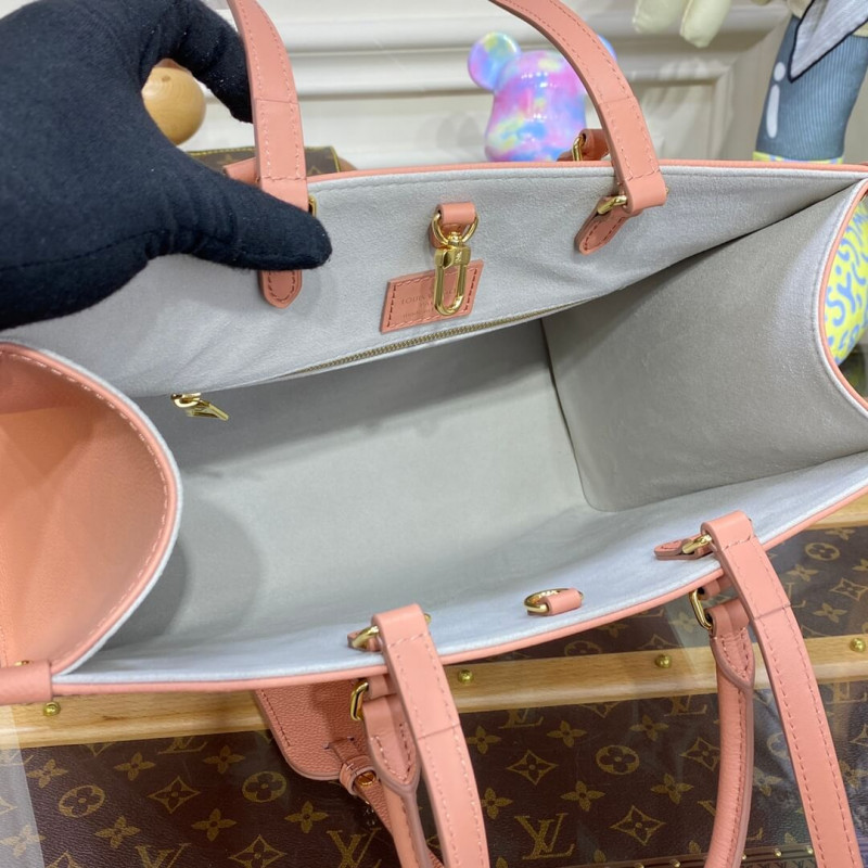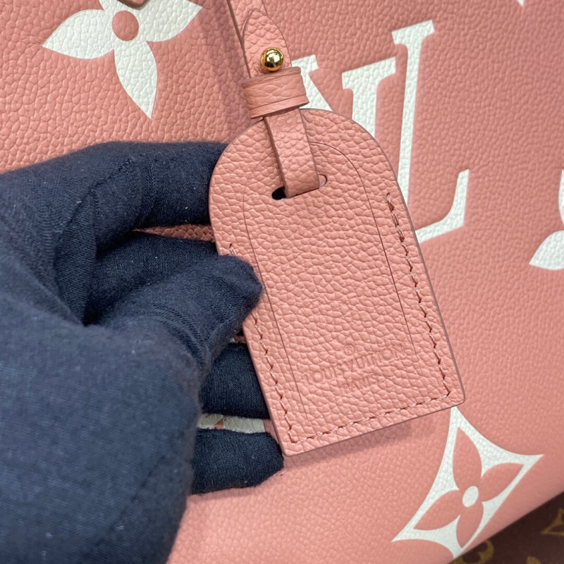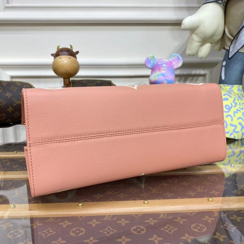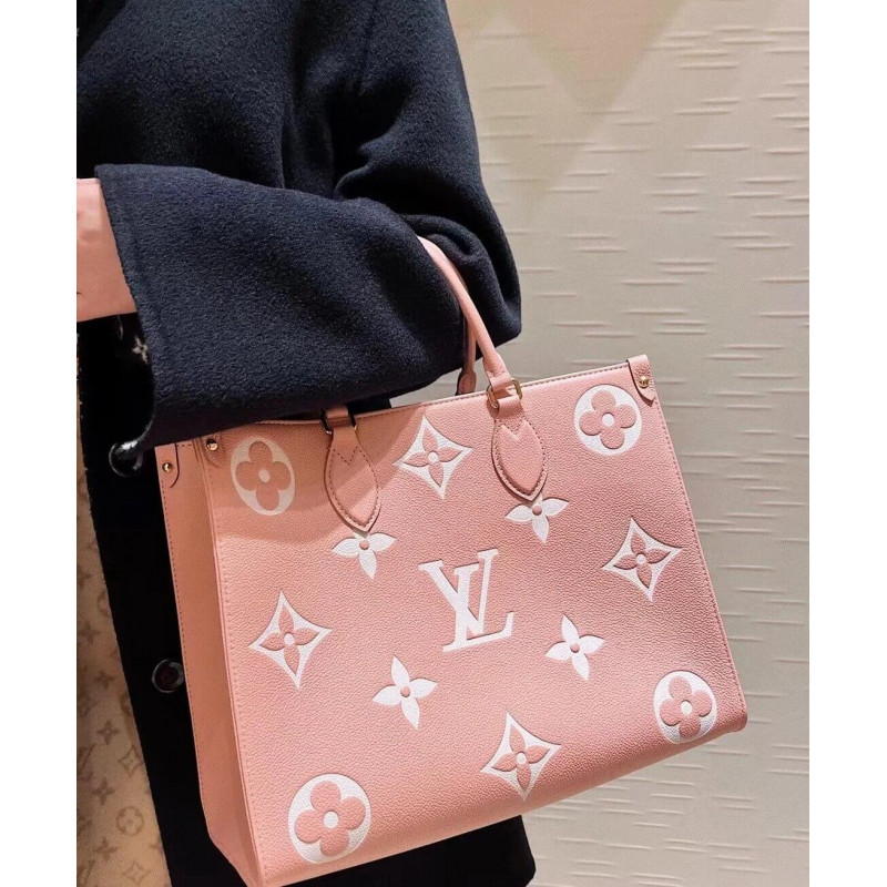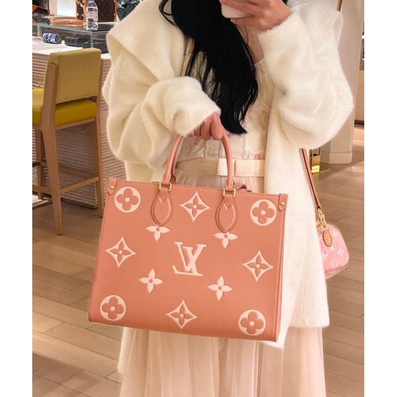 This OnTheGo MM tote bag is made from Monogram Enpreinte leather, with the Monogram Flowers and LVs in a cream color, embossed then printed on a pink background. Lined in a matching greige, this carryall is perfect for work or weekend. The OnTheGo offers both articulated top handles and long shoulder straps.