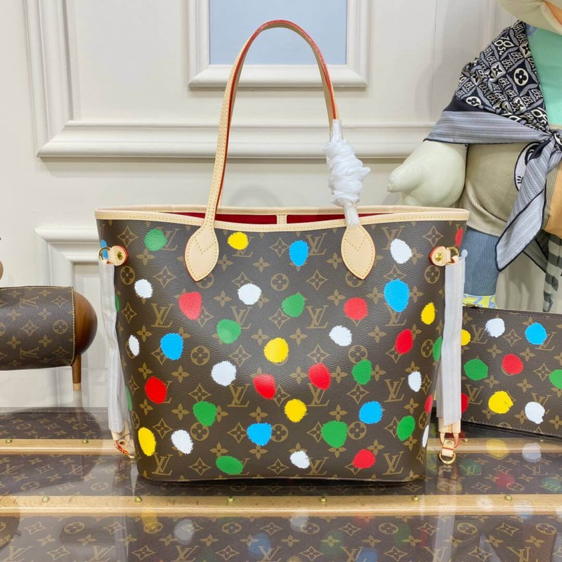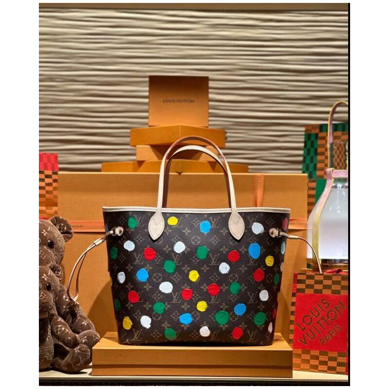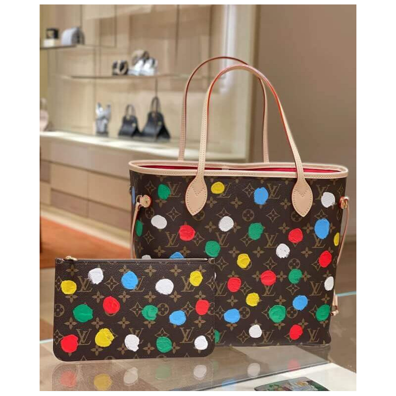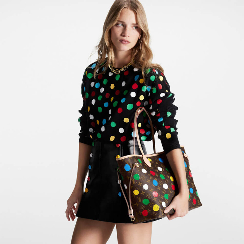 The spacious and elegant LVxYK Neverfull MM tote joins the “Painted Dots” theme as part of the new Louis Vuitton x Yayoi Kusama collaboration. Monogram canvas is decorated with the renowned Japanese artist’s signature dots, a unifying element in her work. A complex screen-printing process gives the colorful dotted pattern a 3D relief effect, adding a burst of vibrant energy to a practical carryall.