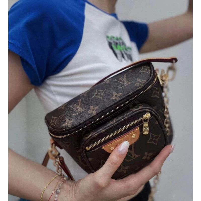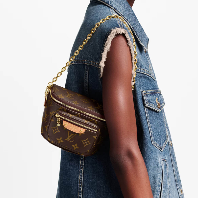 The Mini Bumbag in Monogram canvas is Louis Vuitton s feminine interpretation of the on-trend bumbag format. Designed for versatility, it features a removable, adjustable strap in the House s emblematic natural leather, as well as a removable gold-tone chain, which can be functional or decorative. The bag has a zipped main compartment and a zipped front pocket with an embossed leather tag.