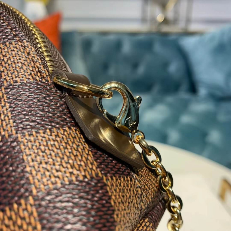 In ever-stylish Damier Ebene canvas the Cosmetic Pouch GM is a luxurious accessory. Shiny golden brass details and textile lining complete its elegant look.