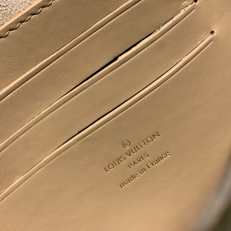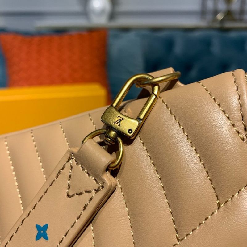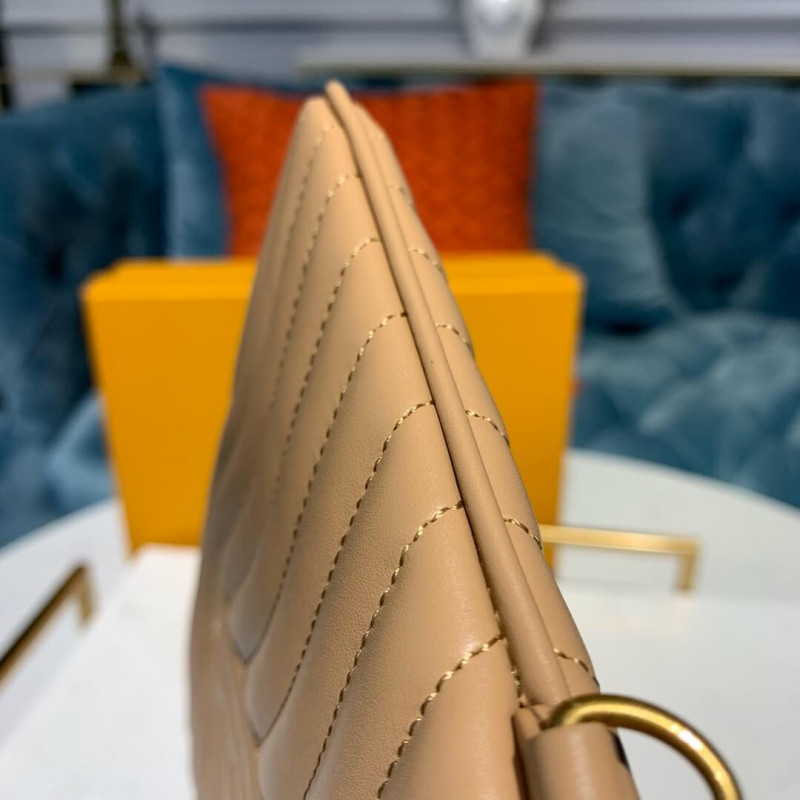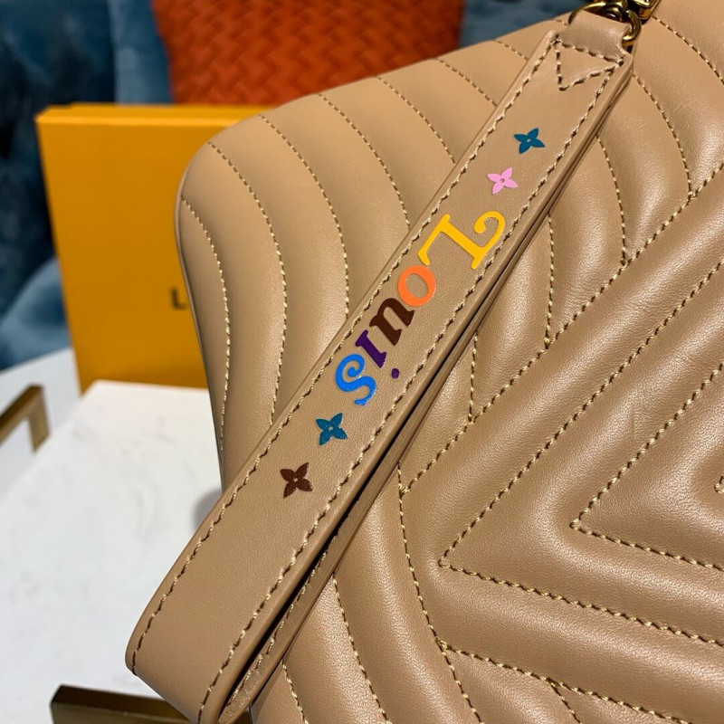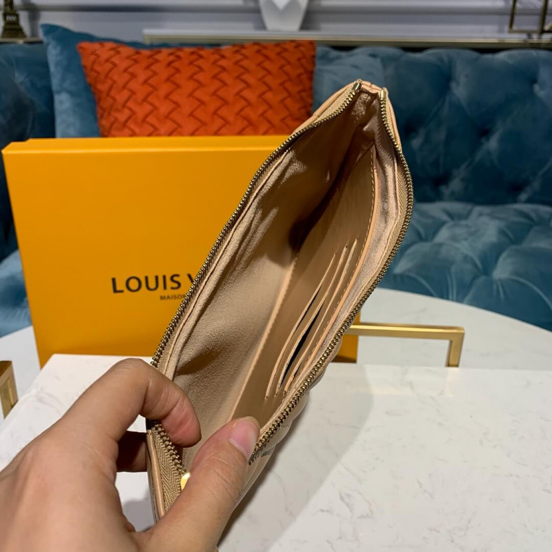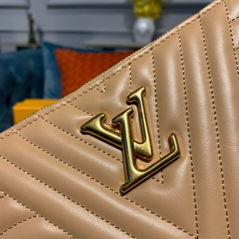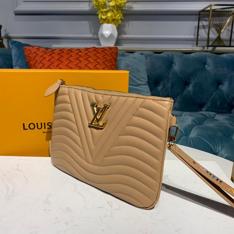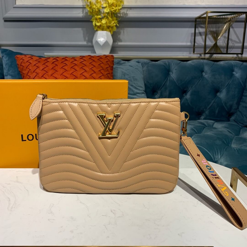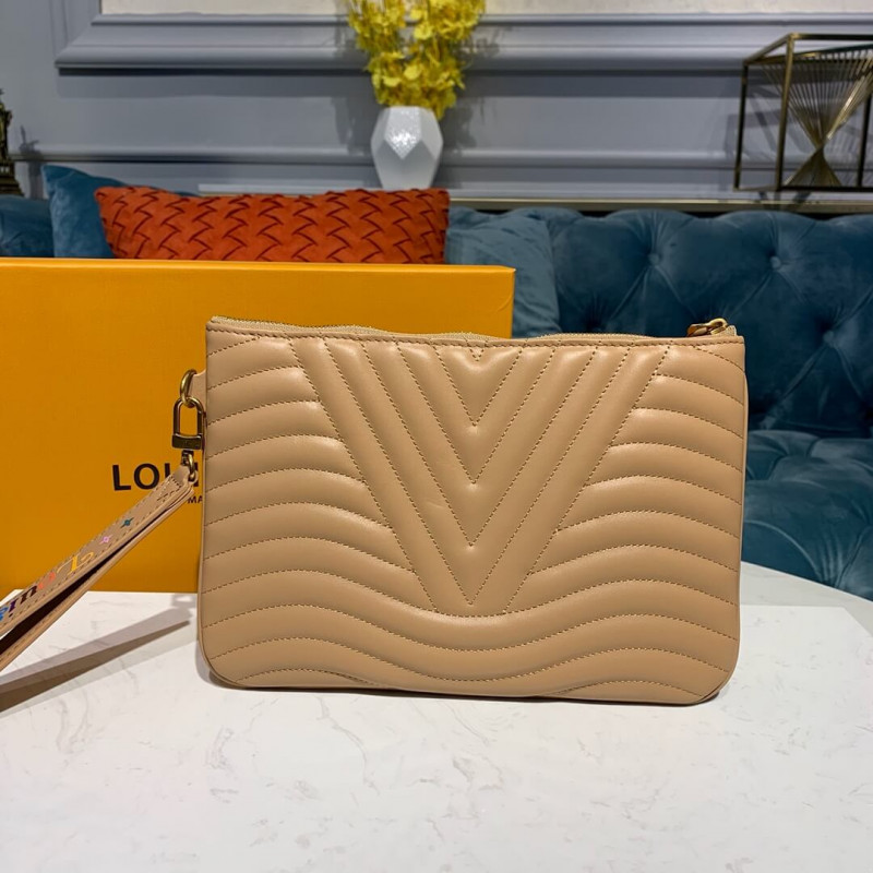 Crafted from smooth calf leather, the Louis Vuitton New Wave zipped pochette displays the signature wave-pattern quilting of the New Wave line. This supple, zipped pouch is a modern and convenient way to carry essentials, including cards and a smartphone. The removable wrist strap features a rainbow-colored Louis Vuitton signature.