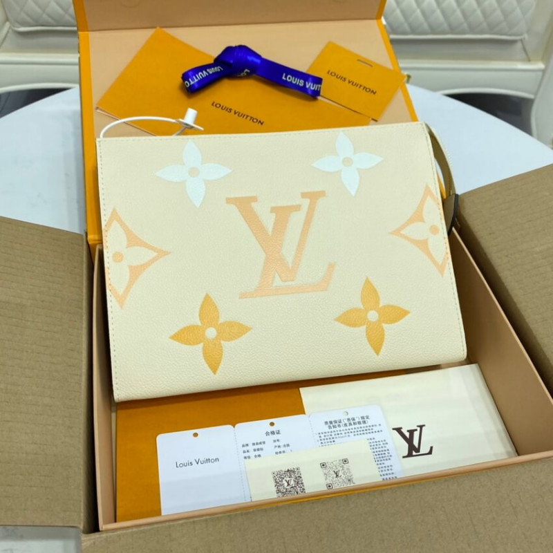 The Toiletry Pouch 26 is made from supple leather embossed with a Monogram motif. The subtle cream color of the leather is complemented by the Monogram Blossoms and LVs printed in shades of saffron. A practical travel companion, this spacious pouch boasts a washable lining and a wide opening for easy access to what’s inside.